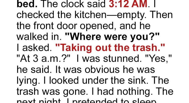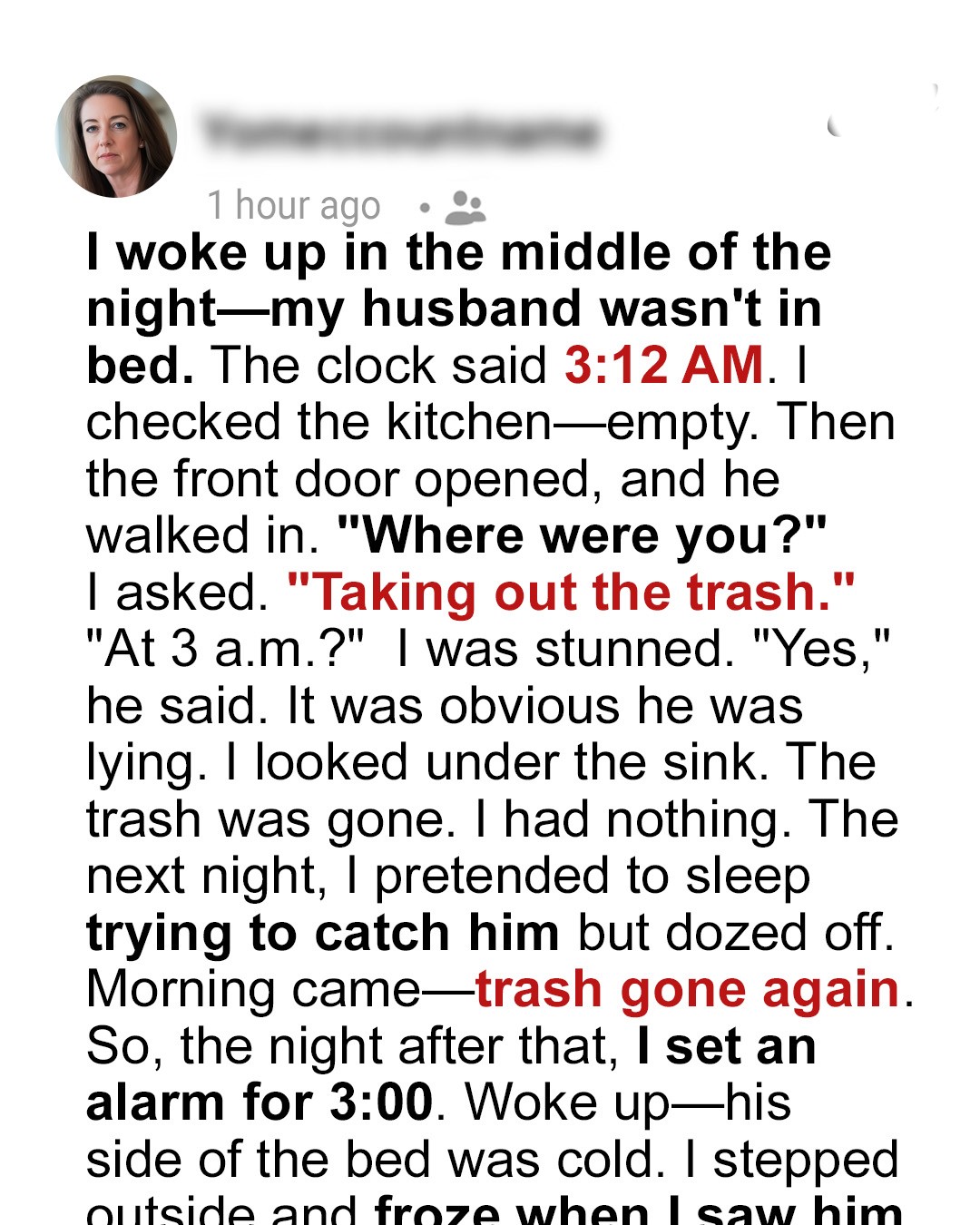 After 22 years of marriage, my husband suddenly started taking the trash out at 3 a.m. He’d never volunteered for it… not once. So why now? One night, I followed him and what I discovered broke my heart in ways I wasn’t ready for.I’m Lucy, 47, and I’ve been married to Dave for 22 years. We’ve got two grown kids who pop in for Sunday dinners, but mostly it’s just me and him now with our traditional morning coffee, grocery runs, and soft arguments about thermostat settings.It was that quiet, cute, and boring kind of love you think is unbreakable… until the bedroom felt eerily quiet that Tuesday night in March.
