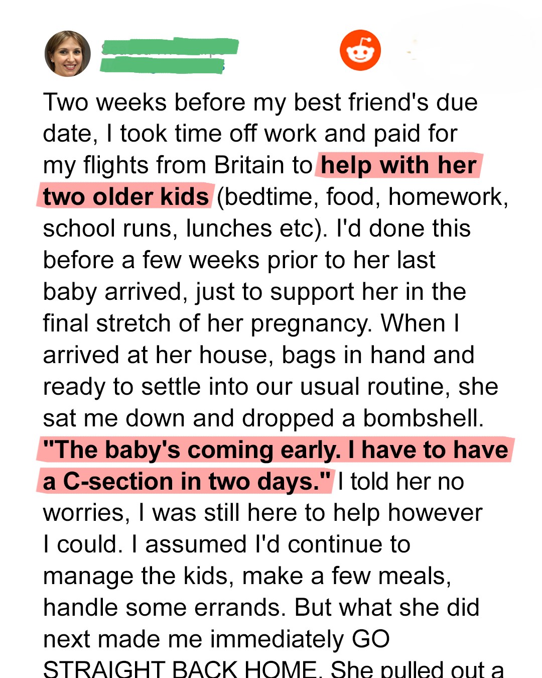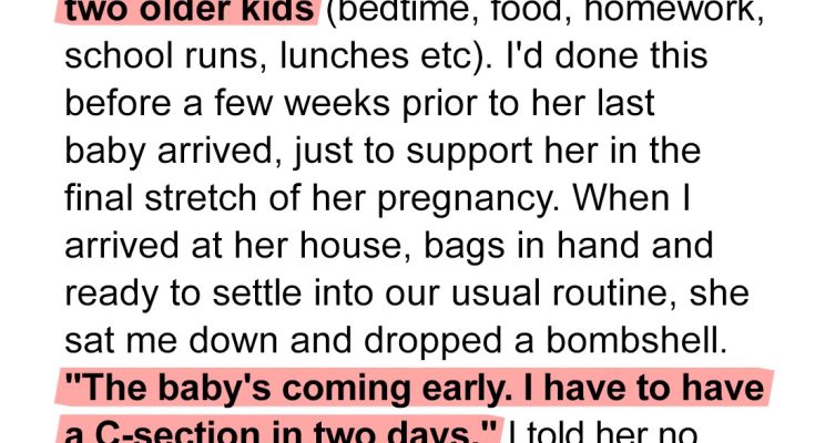 The plan was simple. I’d arrive a week before her due date to help with the final stretch of pregnancy, keep her company, and maybe take the kids to the park so she could rest. Then, after the baby came, I’d stay another week to help with the adjustment period.