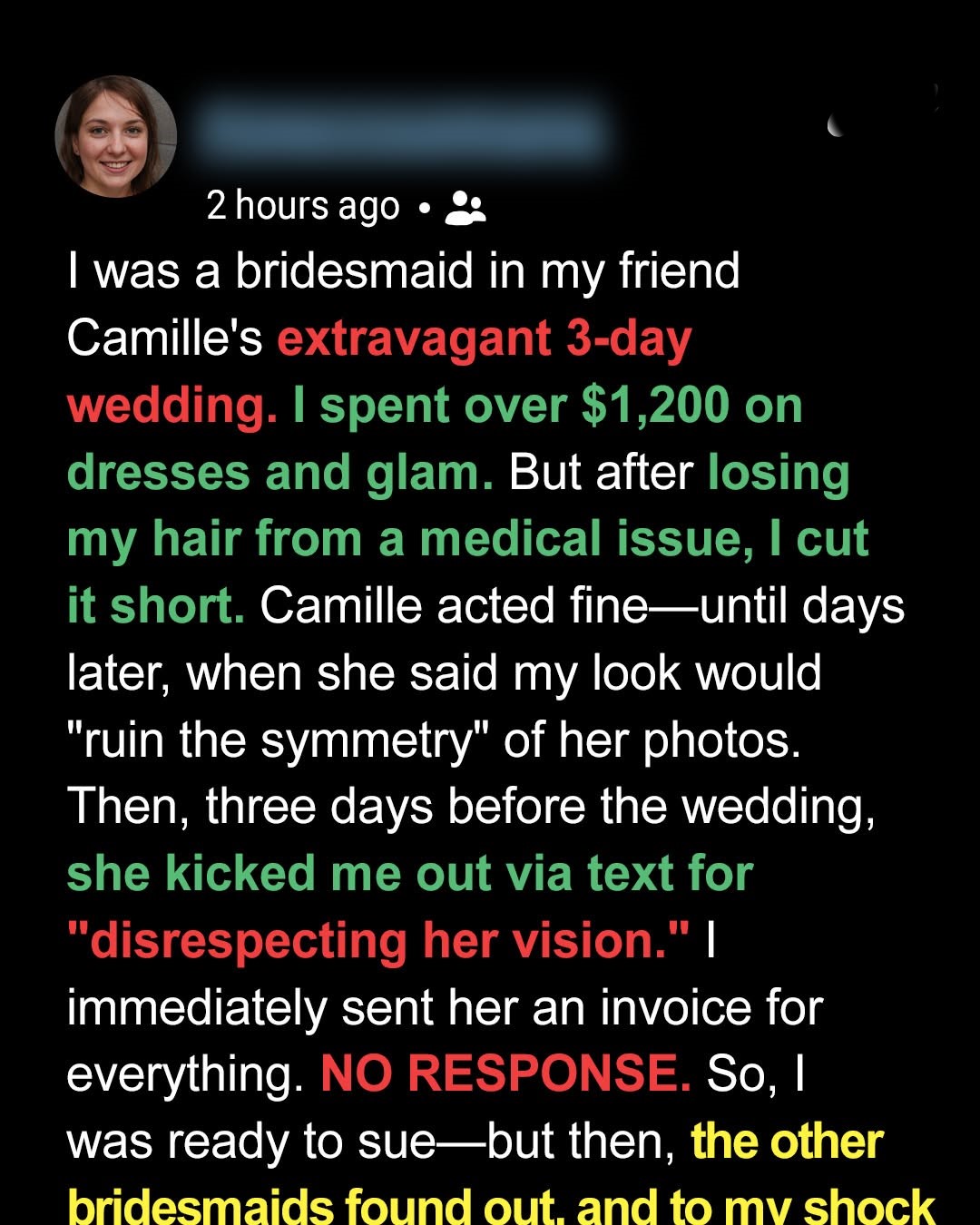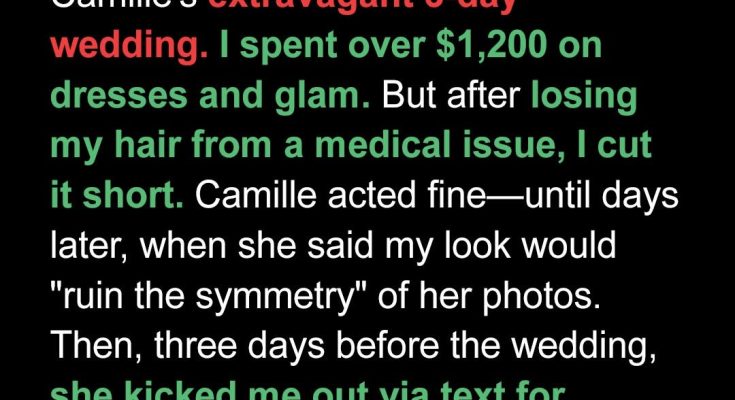 My hair had always been my favorite feature — long, thick, dark waves that reached the middle of my back. The same hair Camille had specifically mentioned in her “bridesmaid aesthetic guidelines.”
