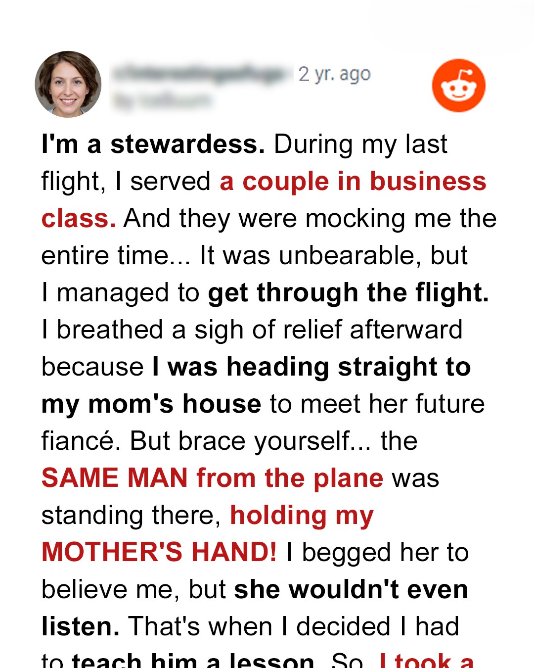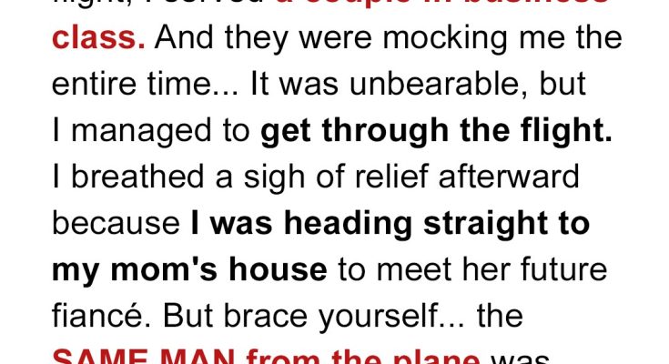 Kristi tended to a rich couple in business class who were very affectionate with each other. The next day, she was shocked to discover the same man engaged to her mother. Kristi knew she had to act, but had no idea what she was about to unleash.High above the clouds in the business class part of a commercial plane, Kristi, in her crisp flight attendant uniform, walked the aisle with practiced grace.She stopped by a couple nestled by the window, absorbed in their private world. The man, in a sharply tailored suit, presented a small velvet box to the woman, whose eyes lit up like the 4th of July.As he opened it, a delicate necklace gleamed, its stones scattering prismatic colors across their seats. Kristi’s eyes widened, and she paused her rounds for a second.