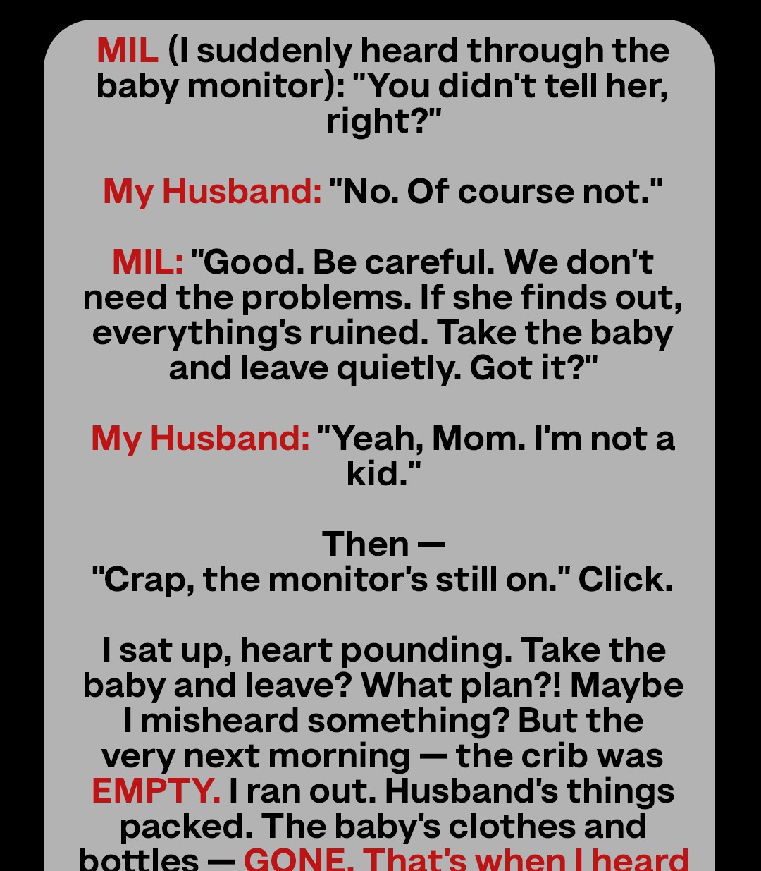 I swung my legs over the edge of the bed but stayed seated, gripping the mattress. I couldn’t storm outside. Not yet. If they were truly plotting something, I needed to understand it first. I needed to be smart, not hysterical. That’s what they’d expect, right? Me overreacting. Being the emotional, unstable new mom.