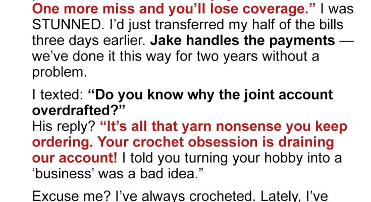 “It’s all that yarn nonsense you keep ordering. Your crochet obsession is draining our account! I told you turning your hobby into a ‘business’ was a bad idea. If you weren’t blowing money on craft fair dreams, we’d still have a balance.”