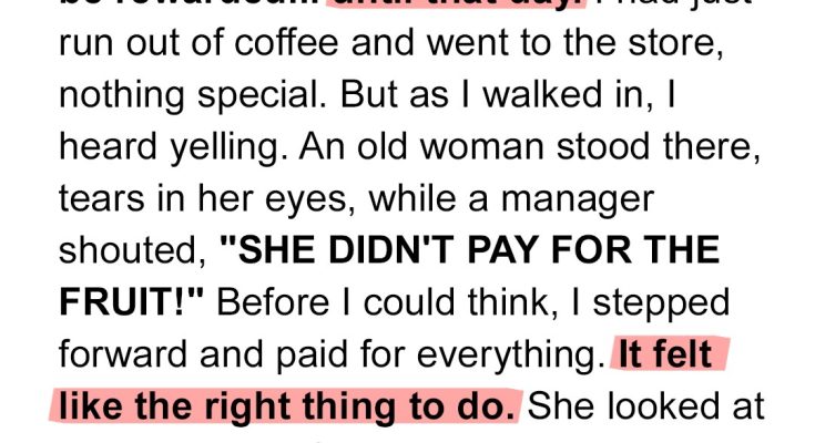 He did, without another word. I added my own groceries to her bag—milk, some bananas, a box of oatmeal. Nothing major. Just enough to help.