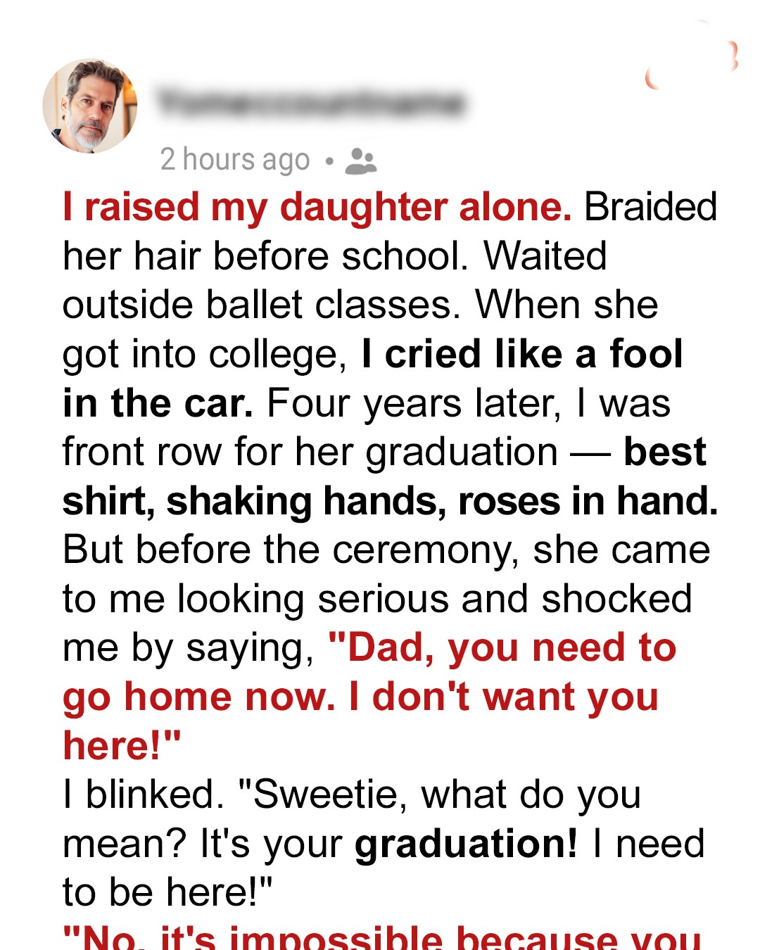 My daughter is my world. I raised her alone with love, grit, and everything I had. I never missed a milestone. Seated in the front row at her graduation ceremony, I was the proudest dad alive… until she asked me to leave. Her reason cut deep… but I knew I had to fight for her again.Fatherhood isn’t a role—it’s a heartbeat outside your body. I raised my daughter, Isabel, alone. No guidebook, no backup, no weekends off. Just me, her tiny hands in mine, and a heart that only beat when she smiled. She was my pride and joy… and I swore nothing would ever break us.