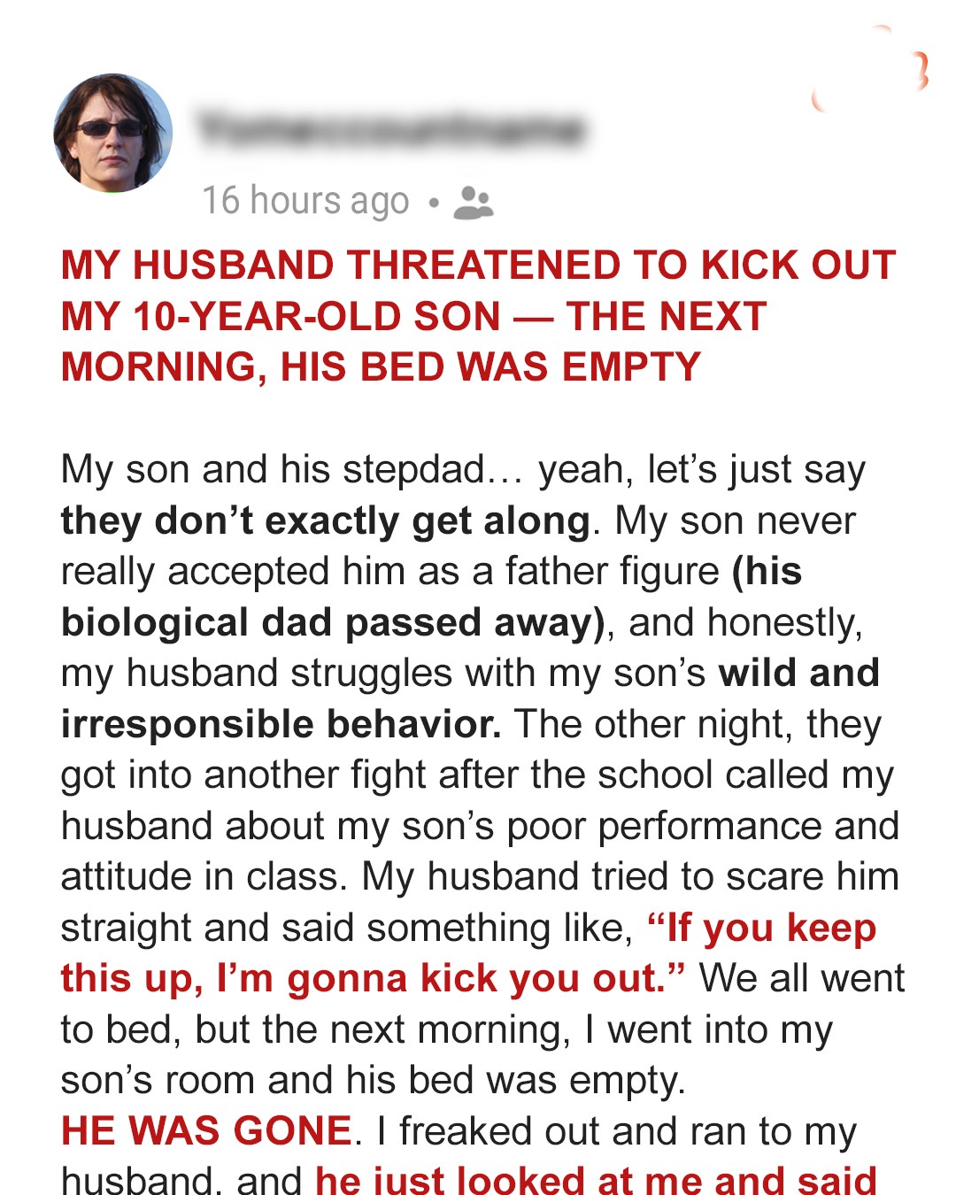 When Sarah’s husband snapped and told her ten-year-old son that he might not belong in their home, she thought it was just harsh words. But the next morning, Noah’s bed was empty. As panic set in, a mother’s worst fears collided with the cracks in their fragile family.The night Daniel died was like the sky had opened up and decided to drown the world. I remember the police officer at my door, water dripping from his hat onto my welcome mat.