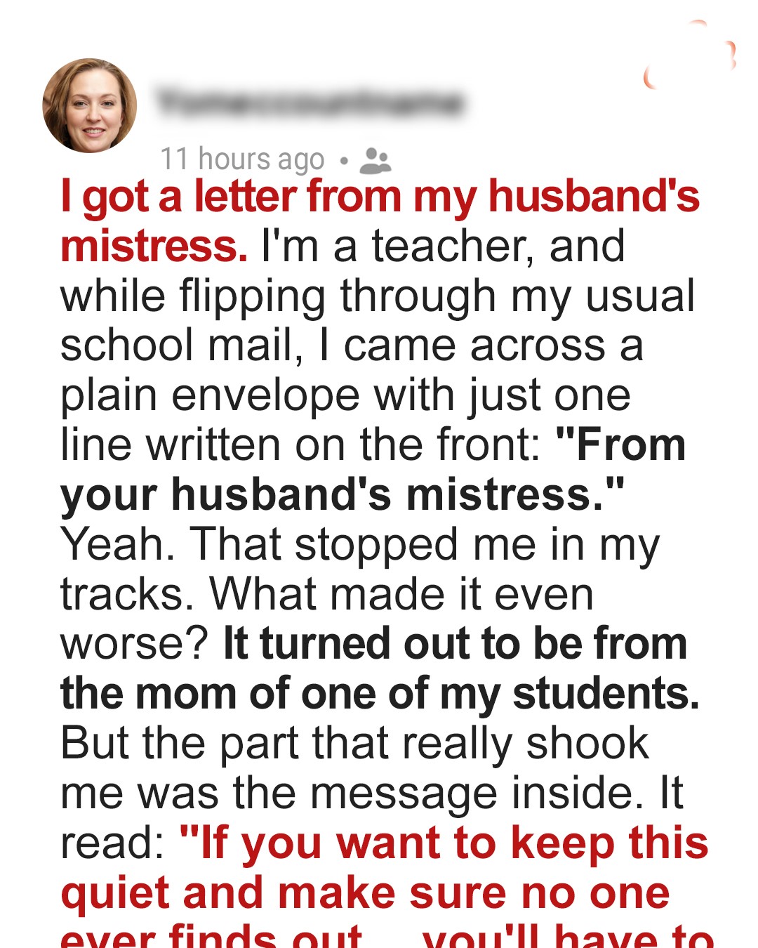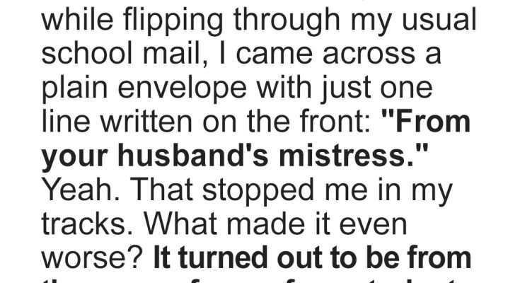 While sorting school mail, a teacher finds a chilling envelope: “From your husband’s mistress.” The sender? A student’s mom. The letter threatens to expose everything — unless she pays. Caught between fear and suspicion, she makes a choice she’ll soon regret.I was at work, sorting through my school mail like any other Monday.The classroom was quiet, and I hummed as I thumbed through the usual mix of memos, supply catalogs, and parent notes.Nothing special. Nothing out of the ordinary.Until I found the plain white envelope with my name scrawled across the front in unfamiliar handwriting, and below it: “From your husband’s mistress.”