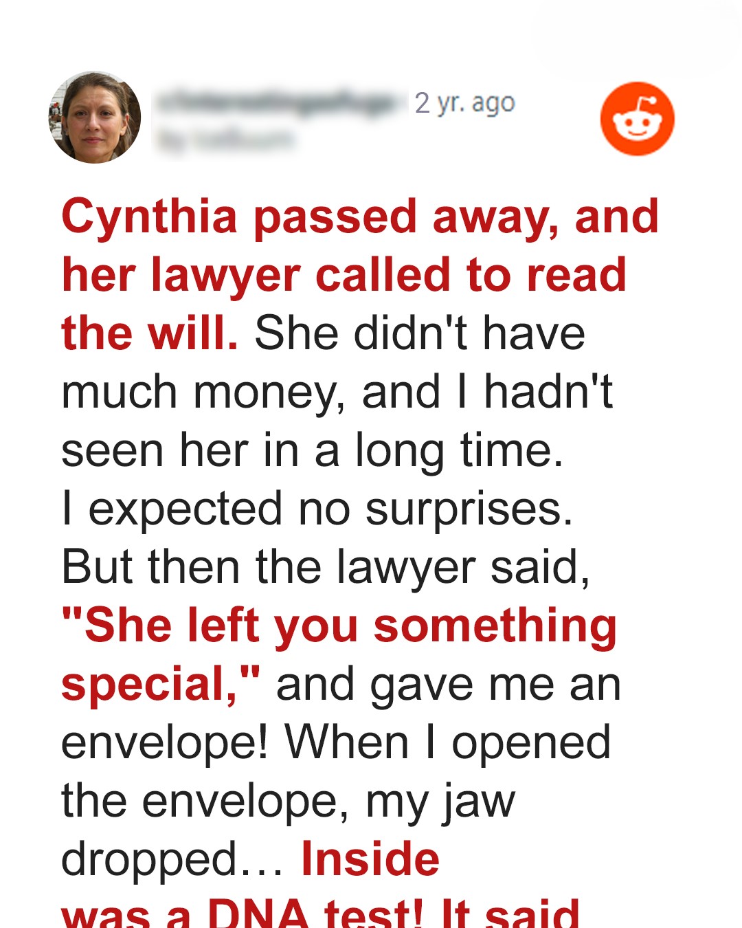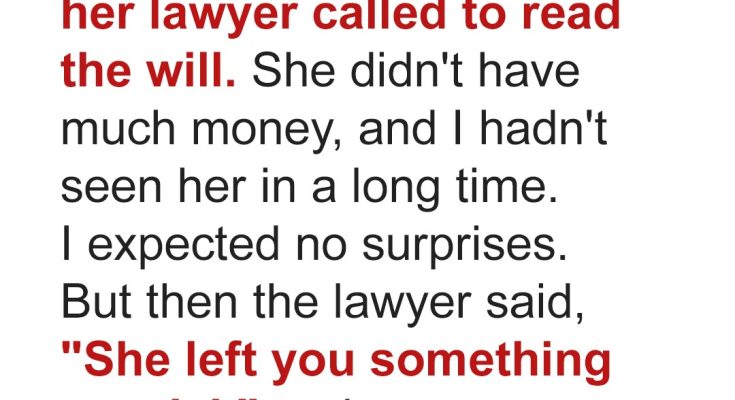 “I’m afraid she passed away last week. She named you in her will. I’ll need you to come in for the reading.”