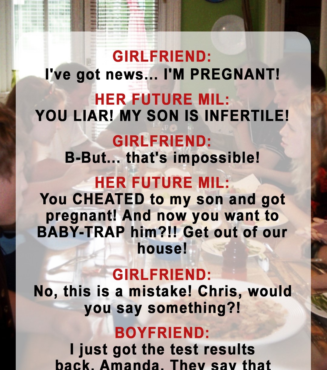 Chris’ parents didn’t accept his relationship with Amanda. When she announced her pregnancy at the dinner, they rushed to call her a cheater because they had just gotten some shocking medical results. Their lives would never be the same.“I just want to get this over with,” Chris sighed in front of his parents’ house door.“They’re your parents, honey. We want them to finally accept me and come to our wedding, right?” his wife, Amanda, caressed his arms.