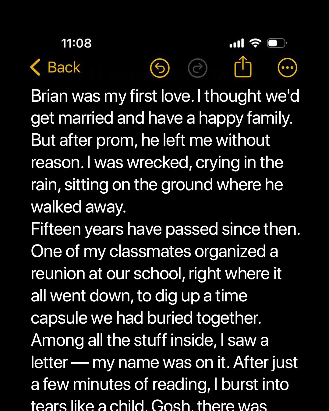 Fifteen years after graduating, I returned to my hometown to open our high school time capsule. What seemed like a nostalgic reunion quickly turned into something deeper. As we unearthed old memories, I discovered the shocking truth about the betrayal and heartbreak that shaped my life all those years ago.We stood in the schoolyard under the dark sky, our class gathered in secret. I felt nervous, hoping no one would find us.