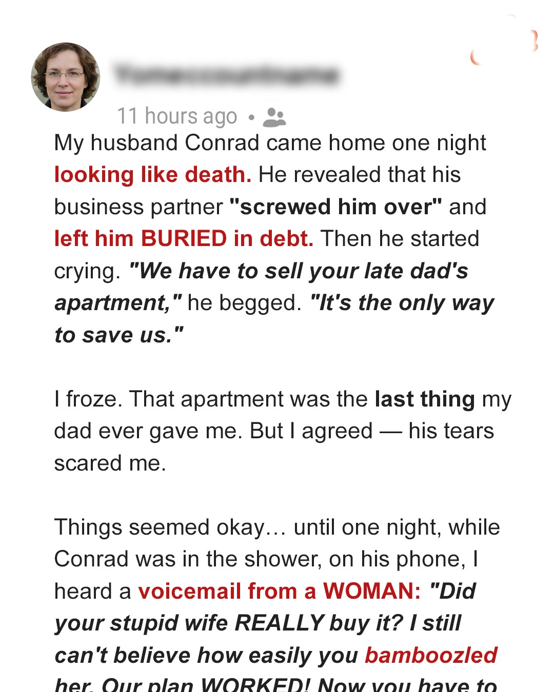 “Conrad told me you screwed him over… said he was drowning in debt. I sold my dad’s apartment to help clean it up.”