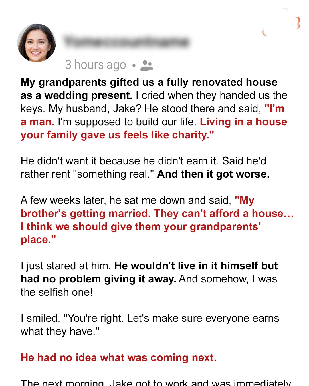 But he wasn’t having an emotional moment. He was genuinely insulted that my family had gifted us a home—us, not just me! He said it made him feel like “a kept man.” I offered to add his name to the deed. He waved me off.