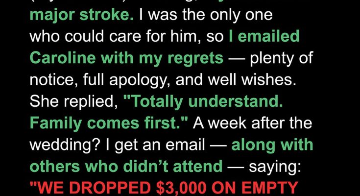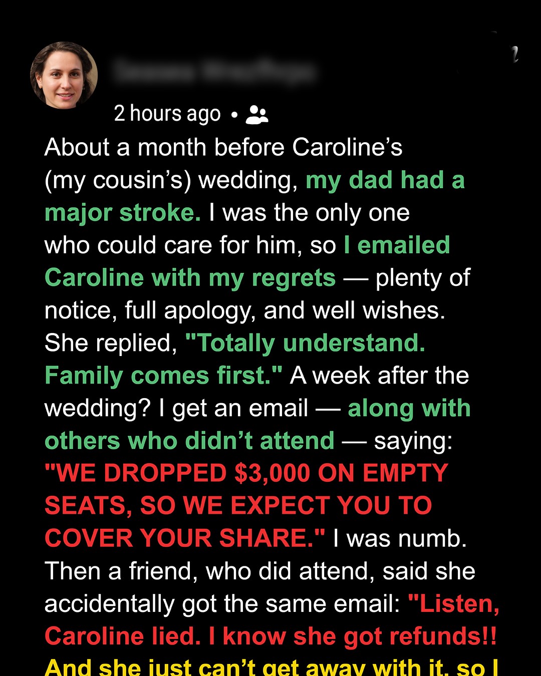 I’ve learned to be wary of people who say “family first,” especially when their actions say otherwise. My cousin claimed she understood when I missed her wedding because of my dad’s stroke. Then she sent me a bill for my “empty seat.” She wanted money but what she got was a reality check, delivered by one very fed-up guest.About six months before Caroline’s wedding, I was genuinely excited. She and I had grown up close, not best-friend close, but close enough that I wanted to show up for her in a big way. I RSVP’d as soon as the invite arrived, bought a gorgeous dress, helped plan the bridal shower, even booked time off work. I was all in.