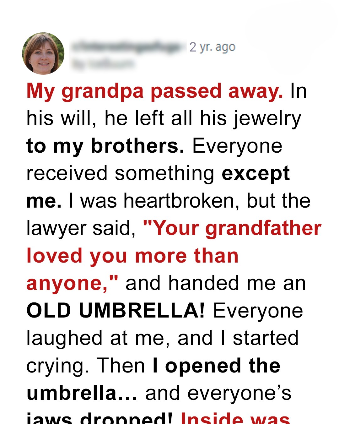 She was dedicated to her grandparents and sacrificed her future to look after them but all they left her was an old umbrella. But there was something hidden in it.Lesley, George, and Wilson Farrel’s parents had died in a car crash when they were children, and their grandparents stepped forward to raise them. George had been eleven, Wilson nine, and Lesley just five.Their grandparents had carefully stretched their parent’s insurance money to pay for the older boys’ education, but when it was time for Lesley to go to college, her grandmother became very ill.