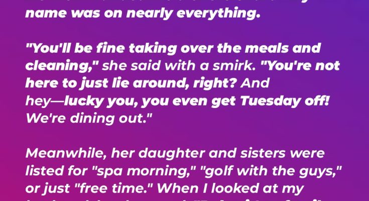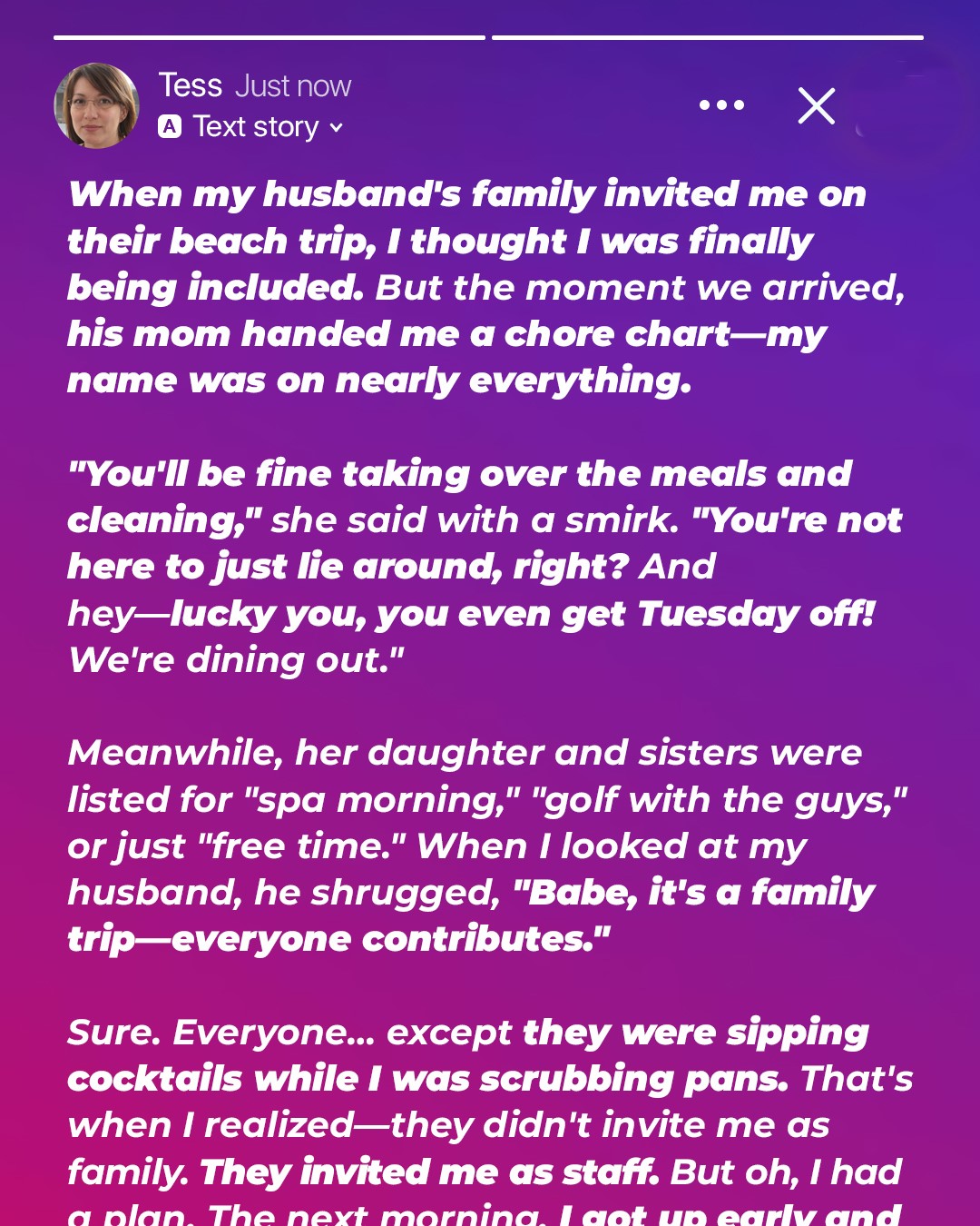 When Tess joins her husband’s family vacation, she’s handed a chore chart instead of a cocktail. But as the waves crash outside, she makes a quiet escape that no one sees coming. This is a story about knowing your worth, rewriting the rules, and choosing yourself. One mimosa at a time.I should’ve known something was off the second Diane handed me the laminated sheet.We had barely stepped through the door of the beach house, salt still clinging to our skin from the walk up the dunes, when she patted my arm.“Tess, honey, I made this to keep things running smoothly.”