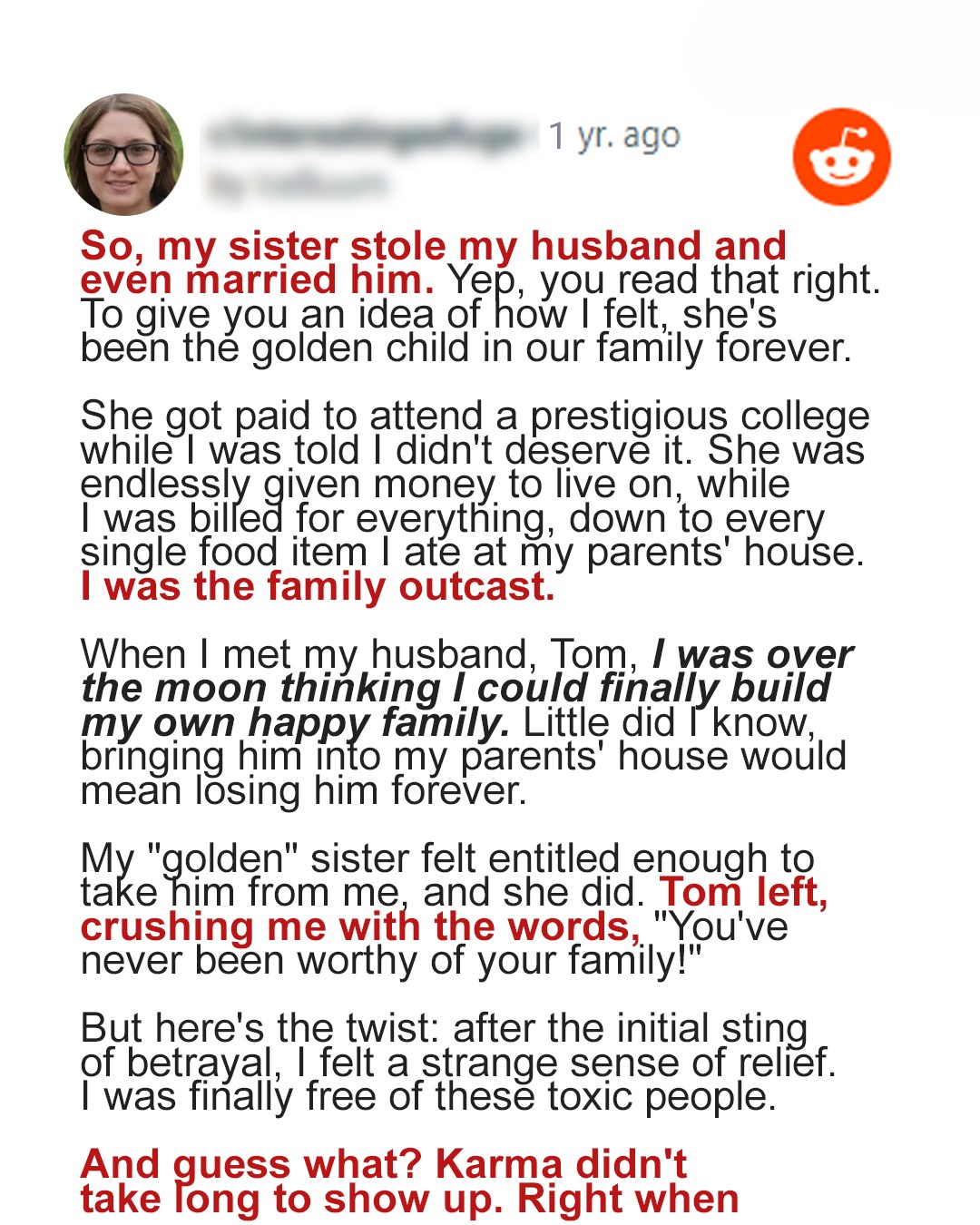 Kate always felt like an outsider in her family, where her mother and sister received all the attention. After her father’s death, her life changed unexpectedly. Kate’s husband betrayed her with her sister for an inheritance, and then, shocked by new circumstances, begged her to take him back.All my life, I felt unnecessary in my family, and the older I got, the more convinced I became of this. My mother always paid more attention to my younger sister, Angela.