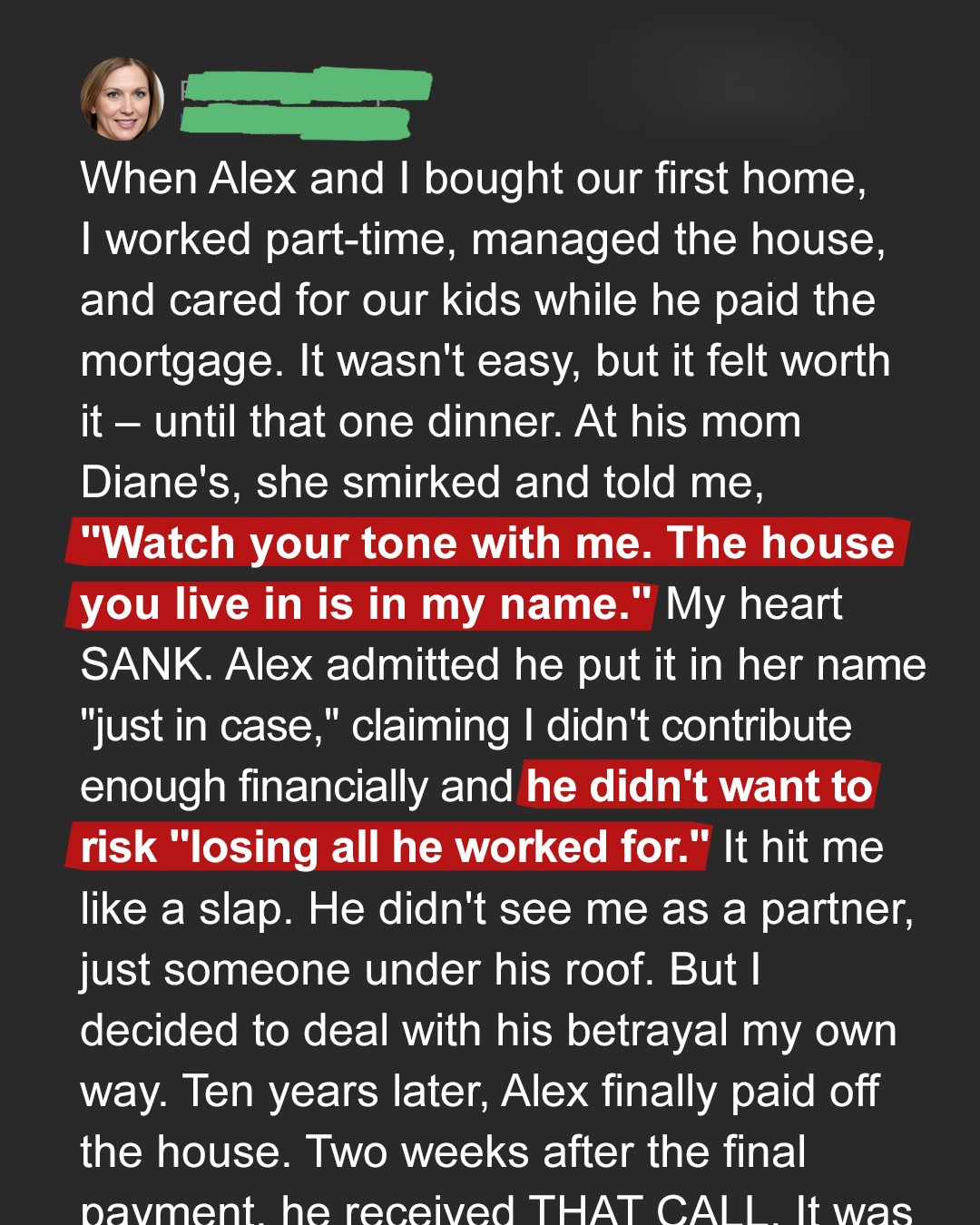 My Husband Secretly Put Our House in His Mom’s Name – Ten Years Later, He Received an Unexpected Call