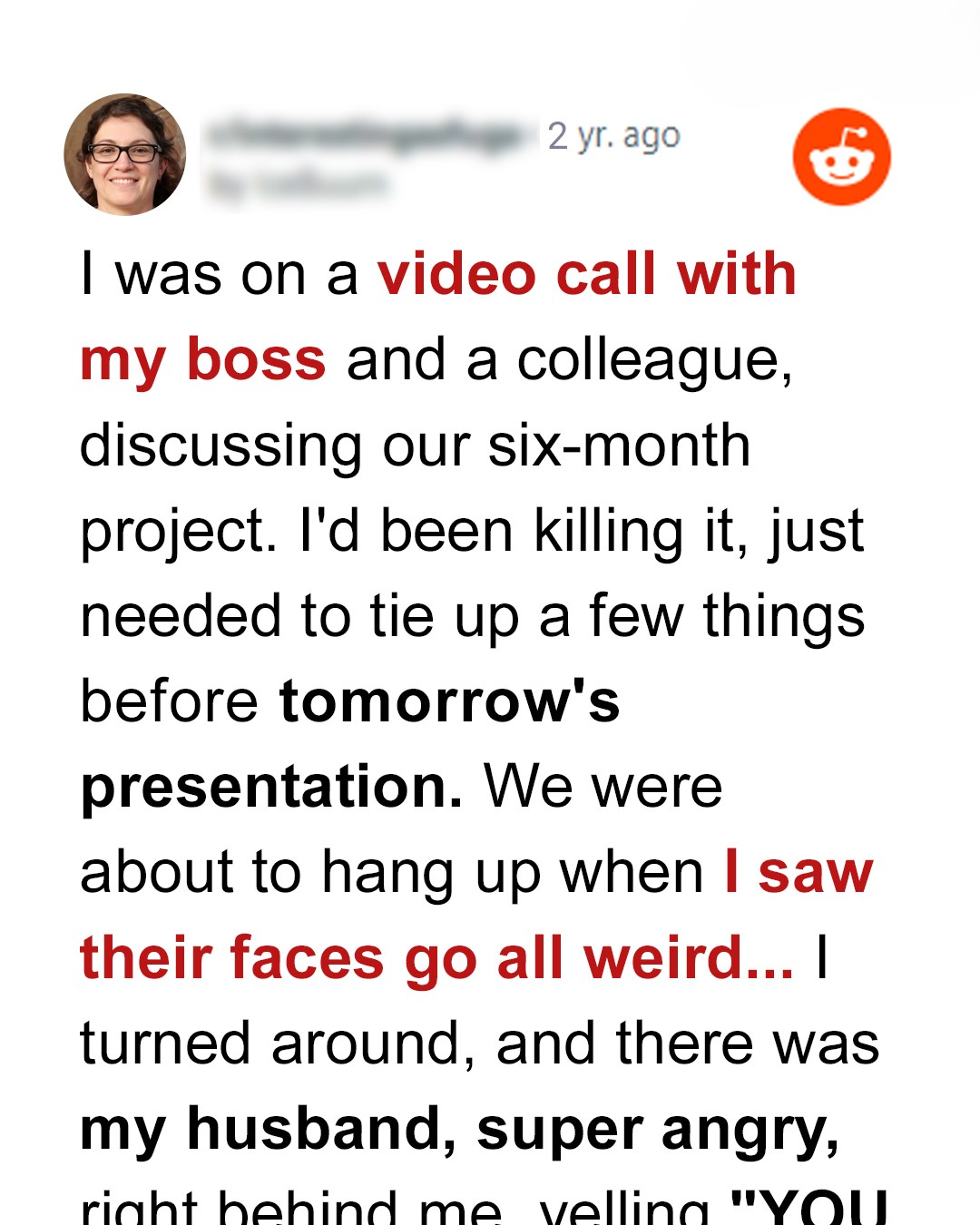When Amanda’s husband, Chris, interrupted a critical video call, she knew it was time to end things. But things only got worse when he showed up at an official meeting the next day and made a show in front of very important people.Amanda stared at her laptop screen. She was finishing up with an important meeting with her supervisors at work. Her nerves grated along a knife’s edge, but not because of the video meeting. Her husband, Chris, was approaching the neat and cozy corner she used for working and taking on-camera calls.“You’re amazing, Amanda,” Mr. Anders said.