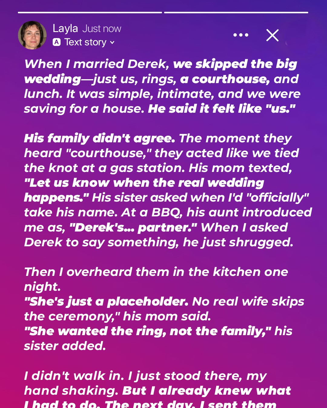 “Layla is just a placeholder,” she said. “I’m telling you. No real wife skips the ceremony. She knew she couldn’t afford it and roped Derek into something small so no one would question her background.”