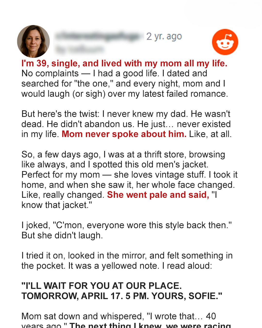 I bought a vintage blazer for my mom at a thrift store—just a small gift. But what I found in the pocket made her face go pale… and turned my quiet life upside down.I had always lived with my mother. She was strong, practical, and slightly ironic. And very lonely. Just like me. We shared morning coffee in silence, folded laundry side by side, and watched reruns of old shows without talking much.Still, there was comfort in the routine — in her presence, even if neither of us said how much we needed it.