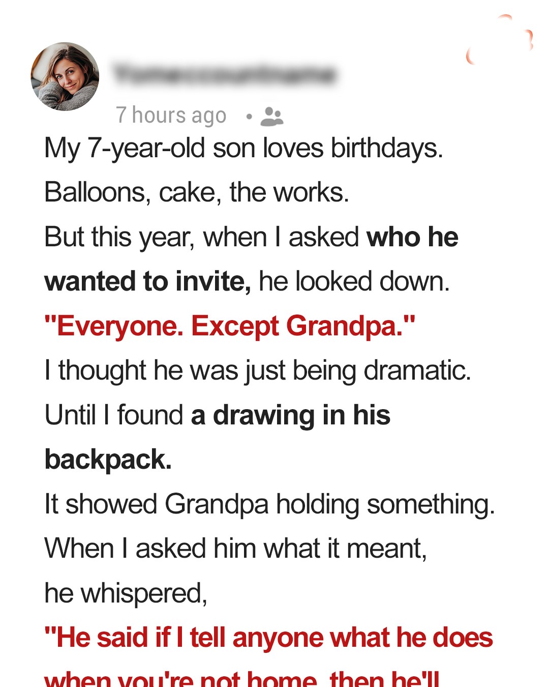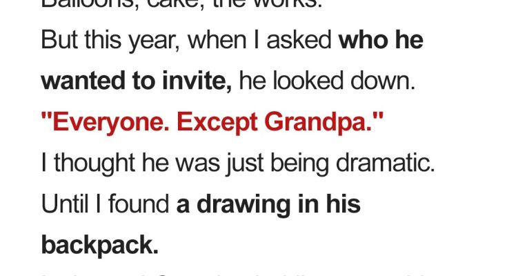 When my son said his grandpa wasn’t welcome at his birthday party, I thought he was just being dramatic. Kids get moody, right? But the weird crumpled drawing I found in his backpack told a different story. I immediately called my dad that night… with questions I never imagined asking.Nothing knocks the air out of your chest like your kid telling you he doesn’t want your dad at his birthday party. I’m Melinda, 35, a proud Navy wife, and mom to the most imaginative, sugar-obsessed, party-planning seven-year-old on the planet.And last Tuesday, he broke my heart a little…