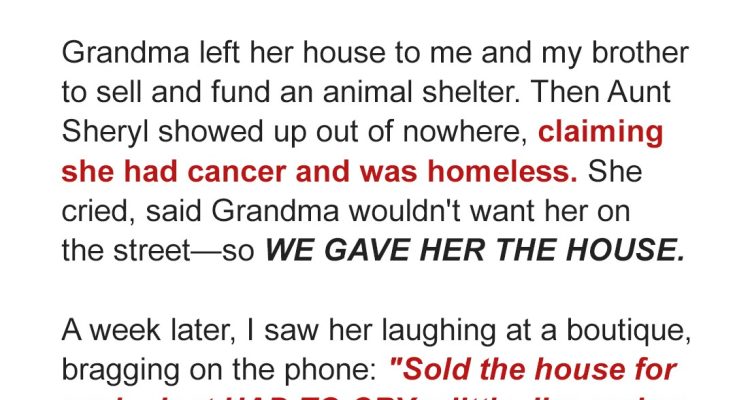 “The lawyer called,” Caleb said, stuffing his hands deeper into his coat pockets. “She left us the house. Split right down the middle. We’re supposed to sell it and use part of the money to start that animal shelter she always talked about.”