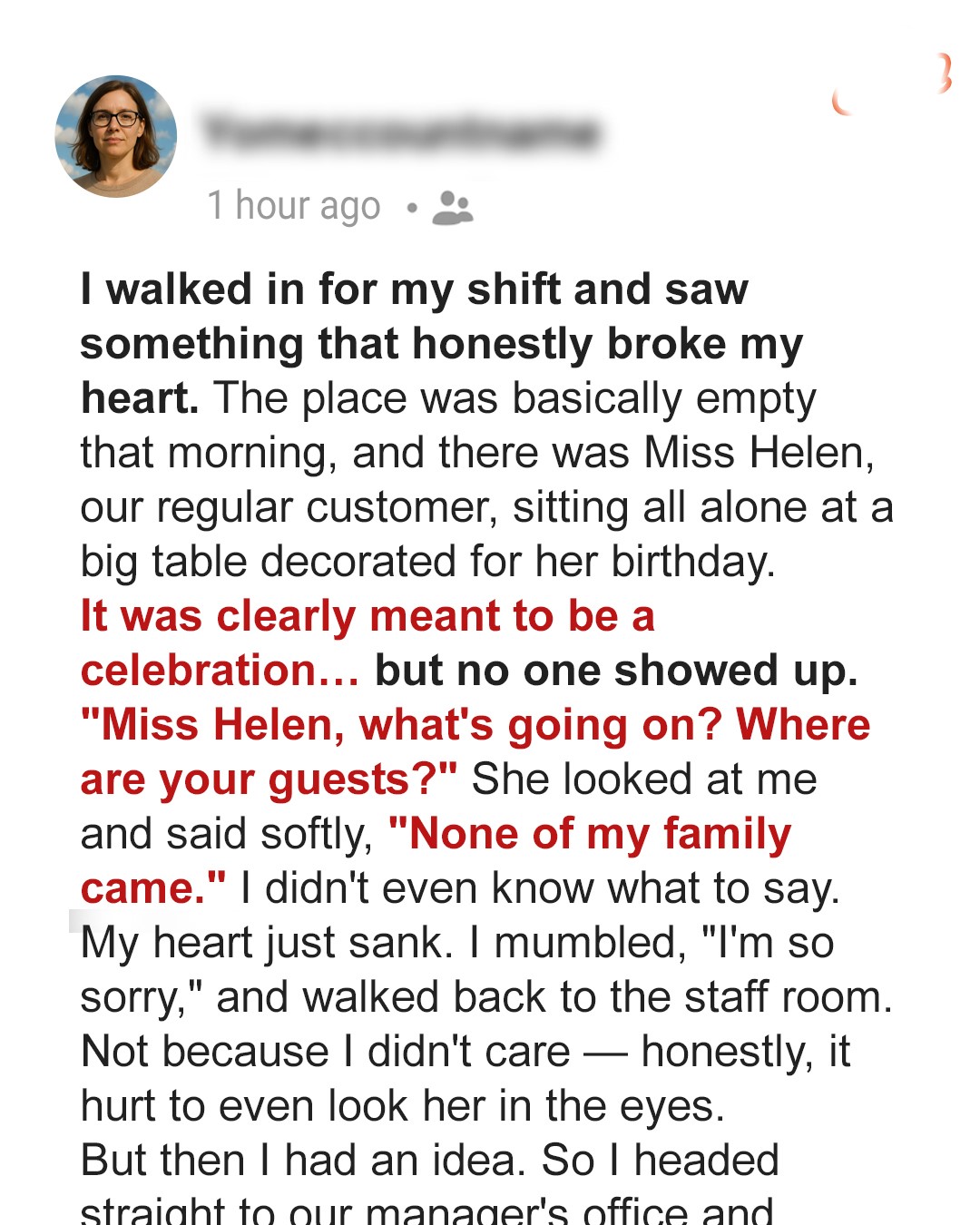 Our regular sat alone at a table covered in birthday decorations, waiting for a family that never came. What started as a heartbreaking moment turned into something none of us at the café would ever forget.I walked into the café like I did every morning—keys in one hand, apron in the other. The air smelled like fresh cinnamon buns and dark roast coffee. It was early. Only two tables were taken. Quiet.