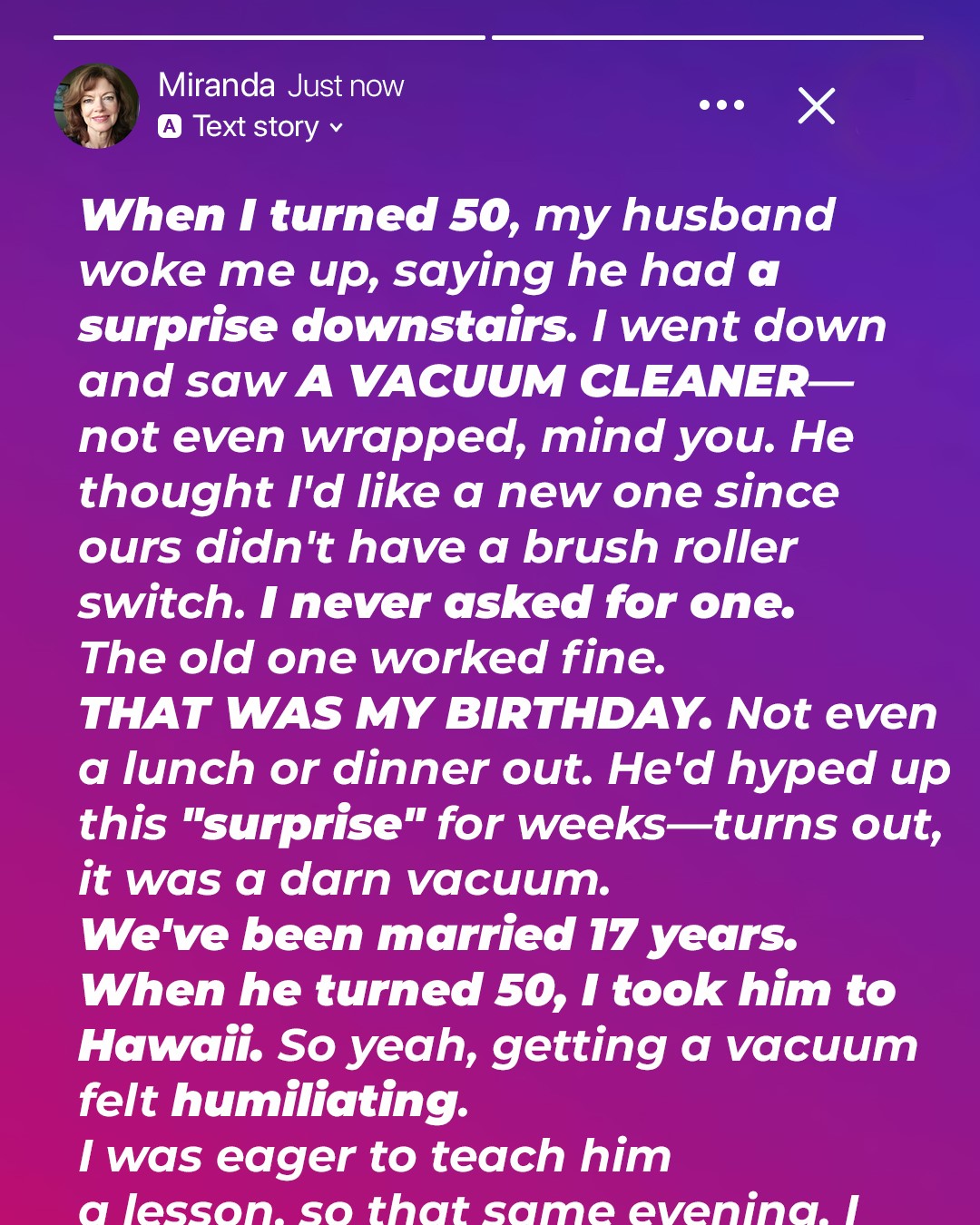 My husband hyped up his gift for my 50th birthday for weeks. But instead of the meaningful gift I expected, I got an unwrapped vacuum. No dinner, no card — just a cleaning tool I never asked for. I felt humiliated… and that night, I made a bold choice to teach him a lesson he wouldn’t forget.The morning of my 50th birthday started with a gentle nudge that pulled me from sleep. My husband Tom snuggled back into bed beside me, his face creased with an eager smile.