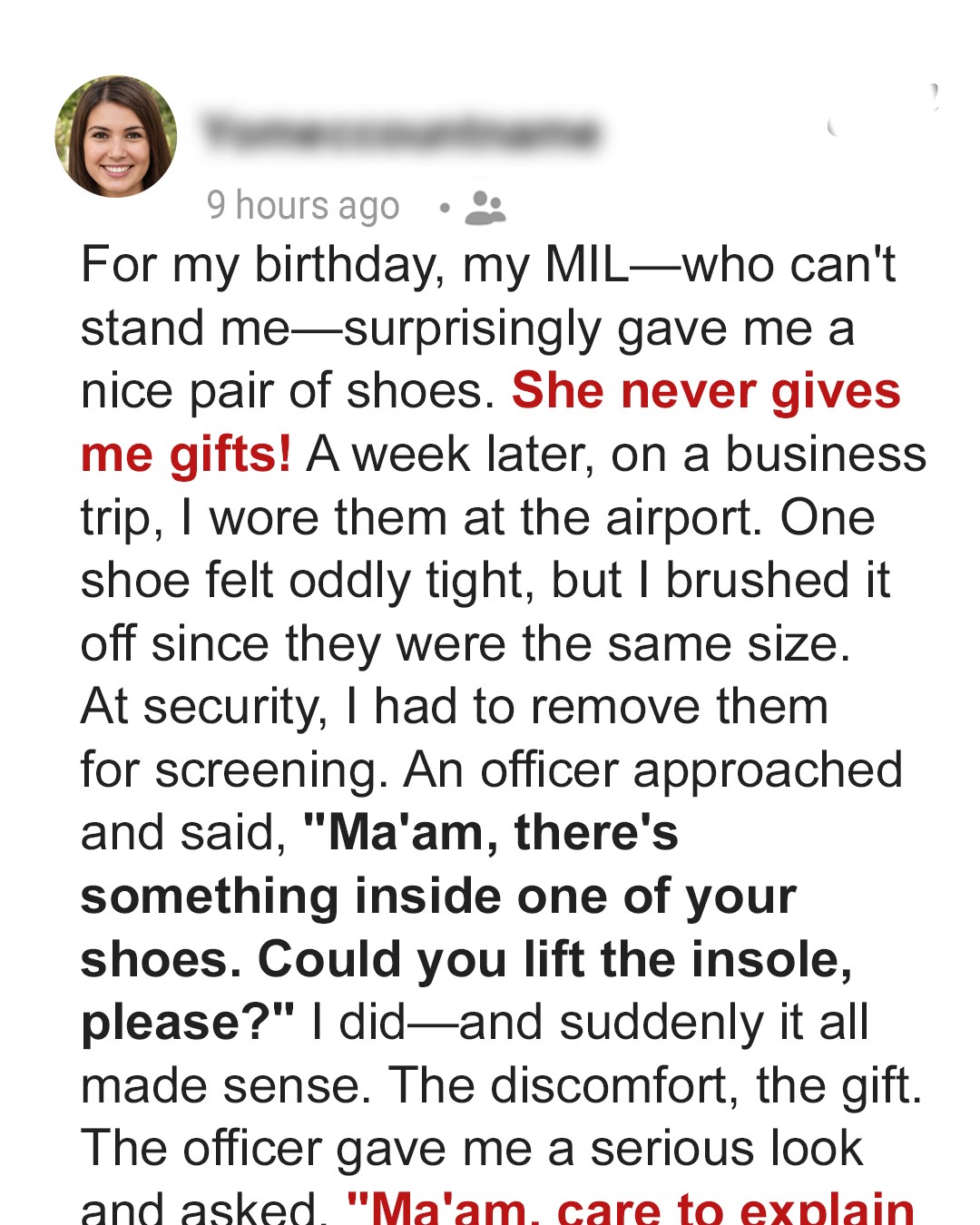 Jess is suspicious when her icy MIL gifts her expensive shoes for her birthday. Her worst fears come true when she wears them on a business trip, and the TSA discovers something suspicious hidden inside. Now, she must unravel if this gift was an attempt at sabotage or something even darker.I should have known better than to trust a gift from Debbie. On looking back now, the warning signs were all there — the too-sweet smile when she handed me the box, the way her eyes glinted with something that wasn’t quite kindness.