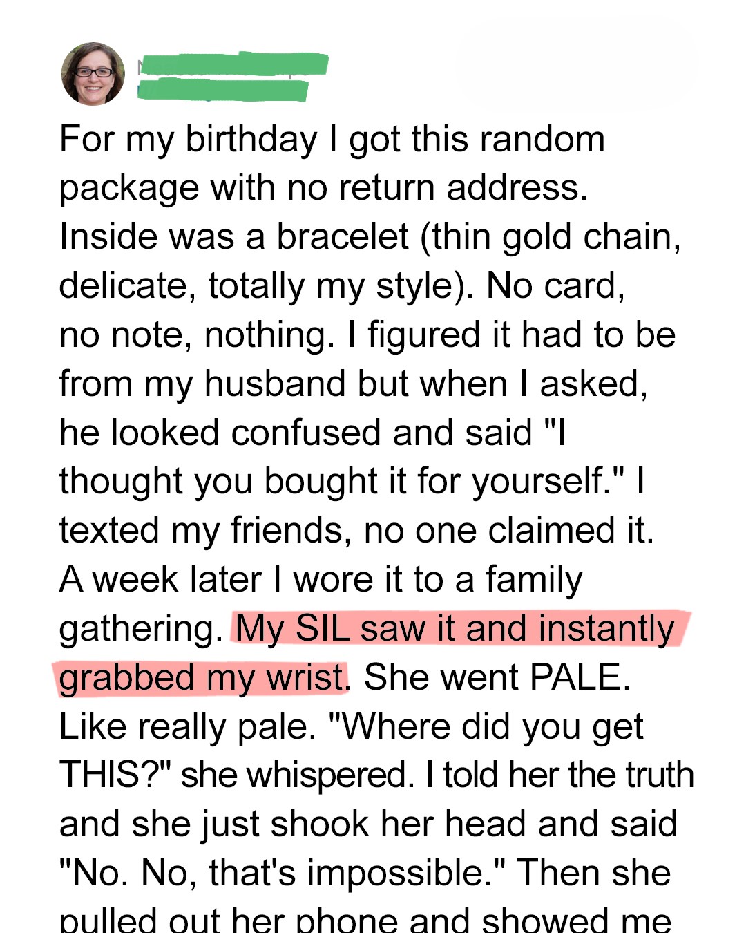 The gold bracelet arrived mysteriously, with no sender and no note. I thought nothing of it until our family dinner when my sister-in-law Emma spotted it on my wrist and turned ghostly pale. The look in her eyes told me this wasn’t just any piece of jewelry.Her trembling fingers reached for my wrist as if she’d seen something impossible. And in that moment, I knew this delicate gold chain had a story much deeper than I could have imagined.
