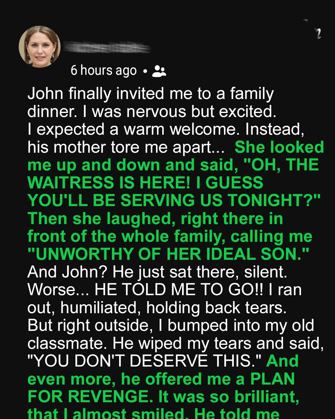 My BF swore his family would adore me, but his mother crushed me in front of everyone. Worse? My BF took her side. That night, I thought I’d lost it all. Turns out, life had other plans.I never planned on living a fairytale, but I did everything to keep my family from falling apart.Two jobs, endless shifts, no days off — fine by me, as long as Mom could rest easy and my sister could finish college like she deserved.