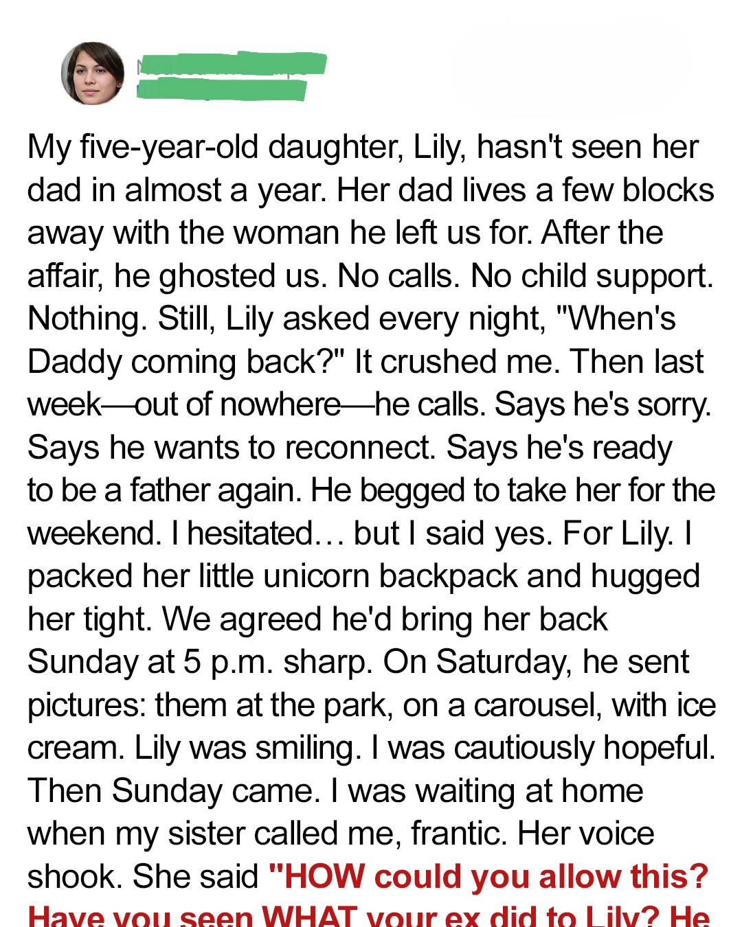 Honestly, I didn’t stop him or beg him not to leave me. My pride wouldn’t let me. But as Lily grew up, she started asking questions that broke my heart.