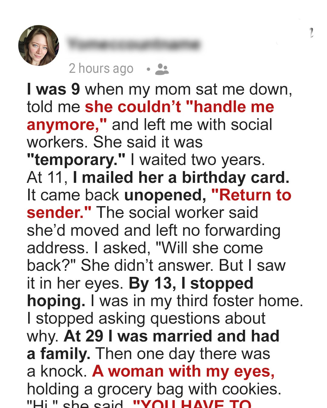 Twenty years after my mother walked out of my life, she showed up at my door with nothing but a grocery bag and demands. What she said next changed everything I thought I knew about forgiveness.My childhood feels like watching someone else’s life through a dirty window. Most of it is blurry, but some parts are crystal clear in all the wrong ways.I don’t even remember my father’s face. He left when I was still in diapers, before I could form any real memories of him.