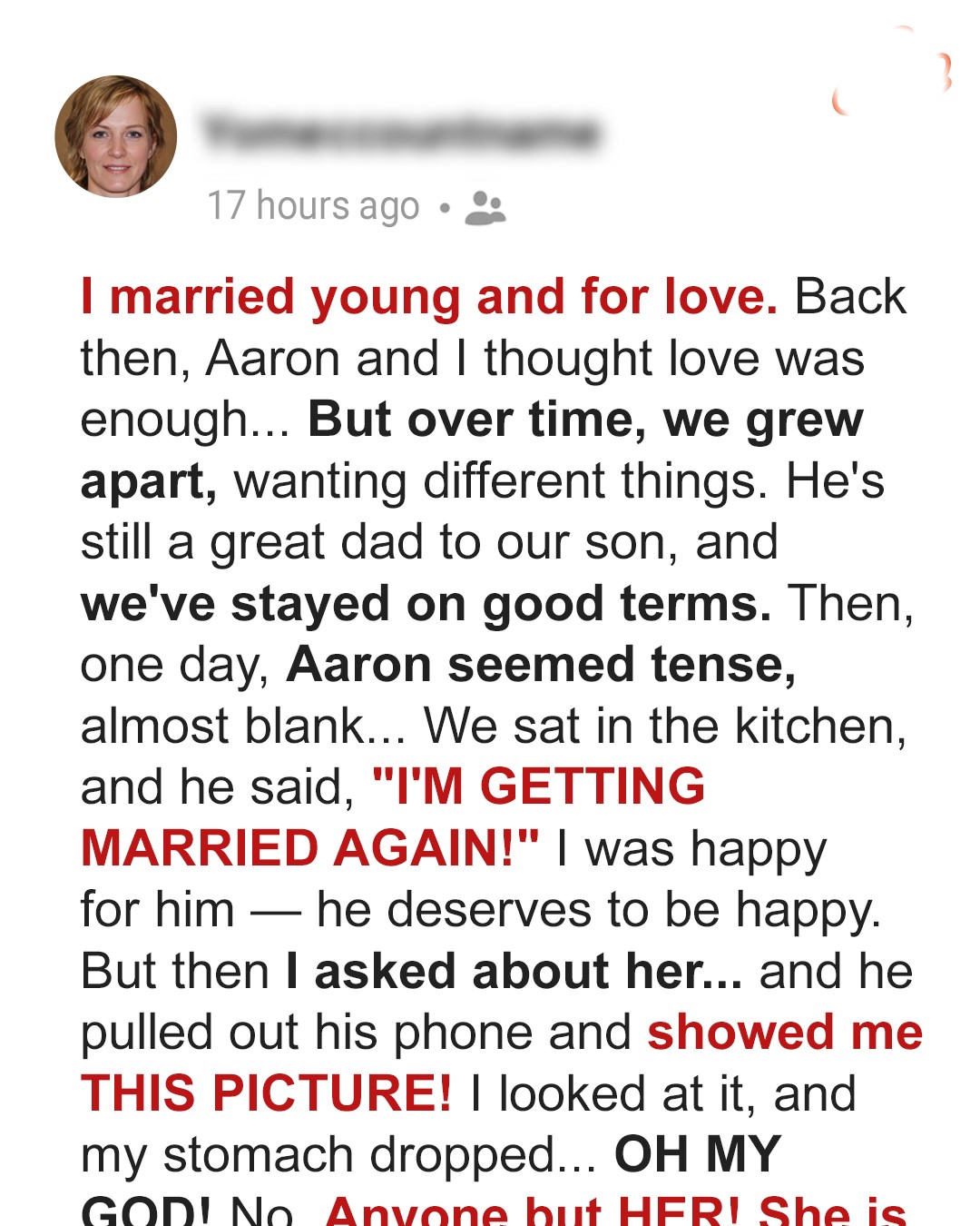 Aaron hesitated. Then, in one breath, he said, “I’m getting married again.”