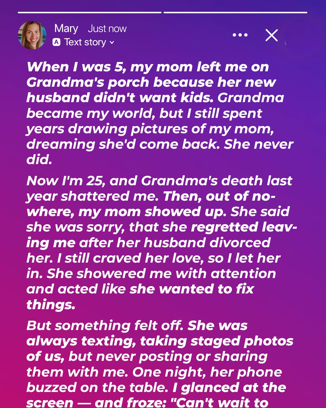 Mom, who I now thought of as Evelyn, sat on my couch and told me her story. Apparently, her marriage to Mark (the man who never wanted children) had fallen apart after only five years. She said she’d regretted leaving me every single day.