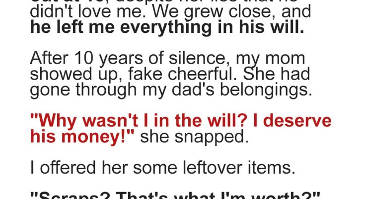 After years of silence, my estranged mom showed up unannounced, cheerful but hiding sharp claws. She’d kicked me out at 15, forcing my dad to pick up the pieces. Now, with his passing, she’s demanding a share of his inheritance. Tensions erupt as I fight to protect his legacy.The day Dad died, a part of me went with him. I sat in his hospital room, holding his hand as the machines went quiet.The nurses warned me it would happen soon, but nothing really prepared me for that moment. The cancer took him fast: three months from diagnosis to the end. Just like that, the person who’d saved my life was gone.