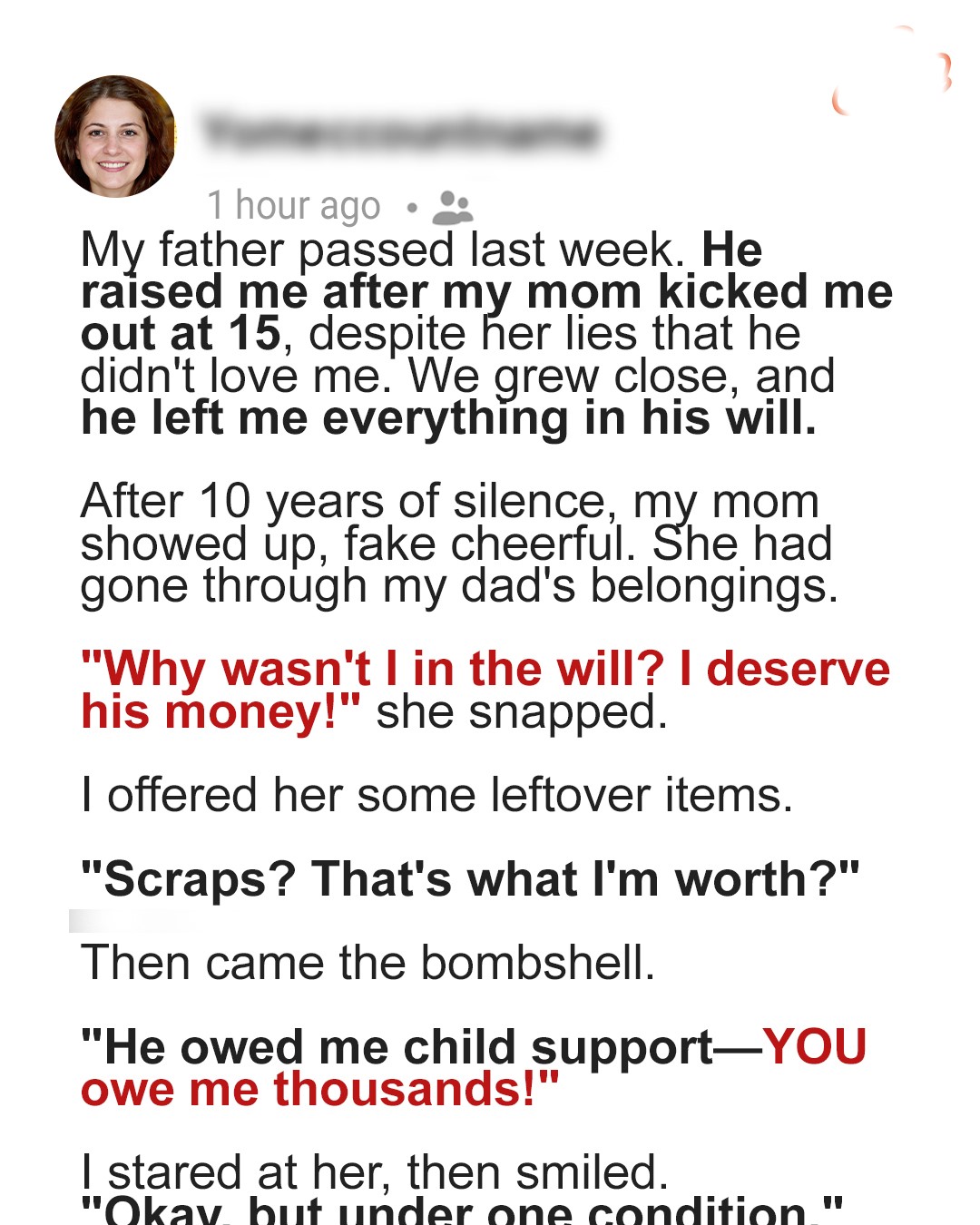 “Okay, I’ll give it to you. But under one condition!” I met her gaze steadily. “Prove somehow that he didn’t pay you child support, that you raised me alone, and that you didn’t kick me out of the house when I was still a minor.”