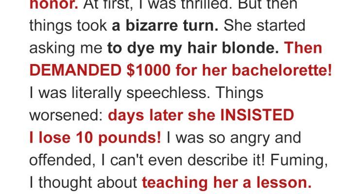 She started oddly, asking me to dye my hair blonde, then demanded $1000 for her bachelorette. I was shocked but things worsened when she insisted I lose 10 pounds. I was taken aback by her demand.