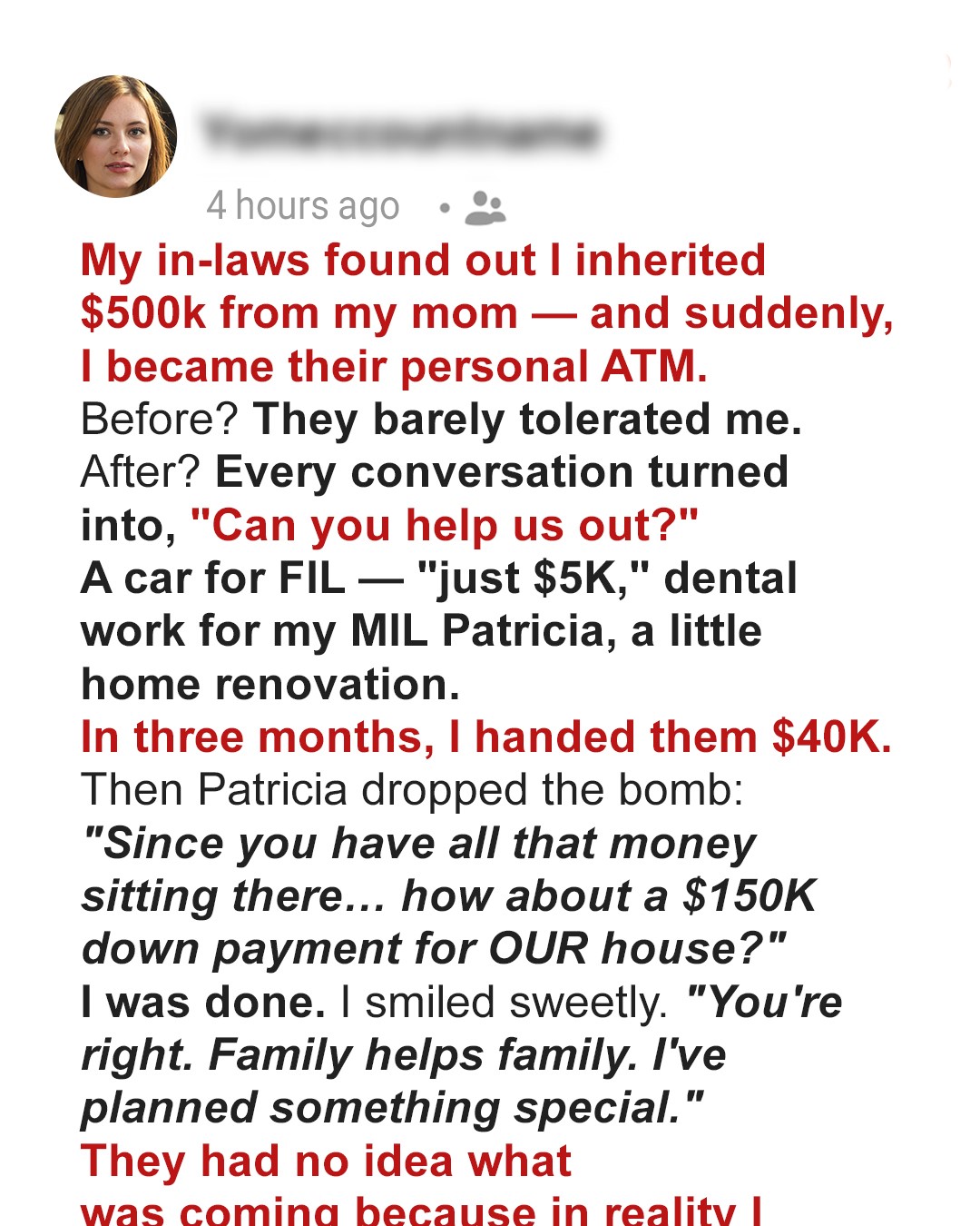 When I inherited $500,000 from my late mother, I thought it would give me security. Instead, it gave my in-laws a reason to sink their claws into me. One request turned into another, until I realized they didn’t see me as family, but just a walking, talking piggy bank. I was done being their fool.The day I lost my mother, I lost more than just a parent. I lost my anchor, my best friend, and my cheerleader. She was the woman who raised me single-handedly, who worked three jobs to put me through college, and who never complained even when life gave her every reason to…