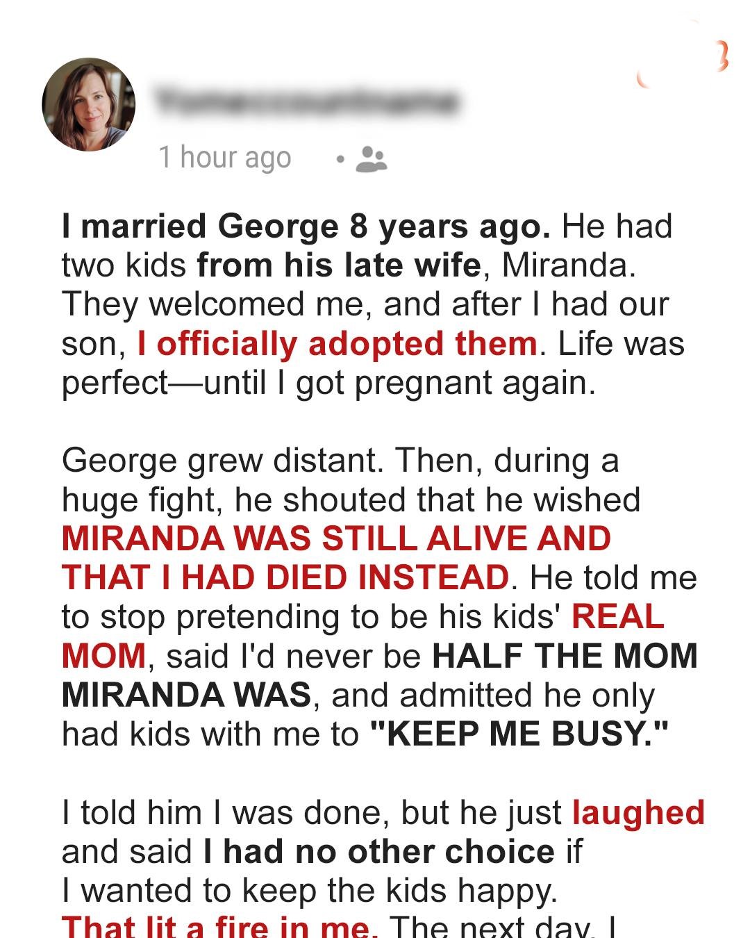 George looked at me, his eyes filled with a cold, bitter rage, and said, “Happy? With you? I wish Miranda was still alive. Hell, I wish you’d been the one who died instead! And you know what? Stop pretending you’re Nick and Emma’s real mom. YOU’RE ONLY HALF THE MOM MY LATE WIFE WAS! Do you understand?”