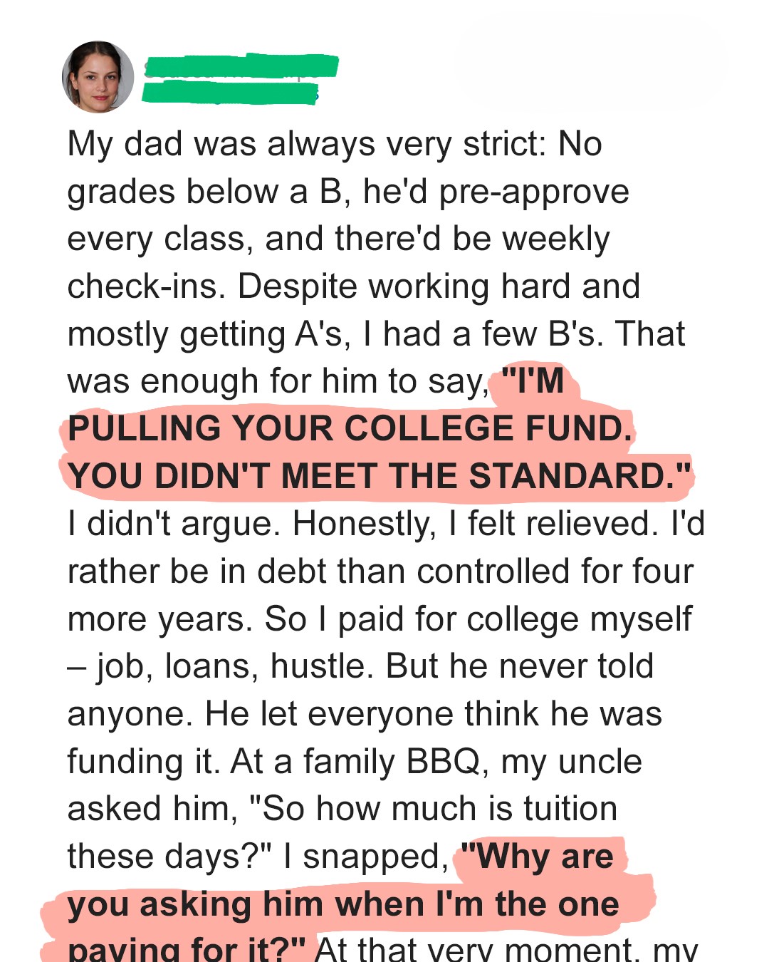 My Dad Canceled My College Fund Over a Few B’s – Then Lied About Paying, So I Told Everyone the Truth
