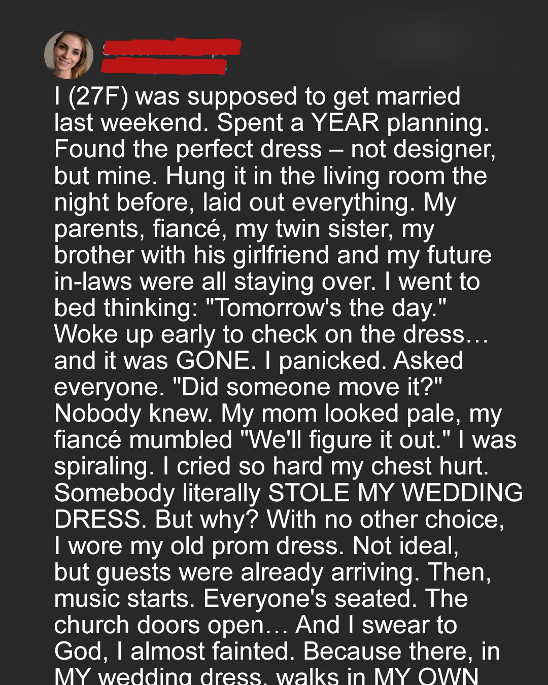 The morning of her wedding, Emily wakes up with butterflies dancing in her stomach. She rushes to check on her dress because it’s the one thing that has to be perfect. But the living room where she hung it so carefully is empty. The hanger sways alone. Where did her dress go?You know that feeling when everything in your life is finally falling into place? That’s exactly how I felt the week before my wedding.I’m Emily, and at 27, I was about to marry the love of my life, start a new chapter, and leave behind all the uncertainty of my twenties.
