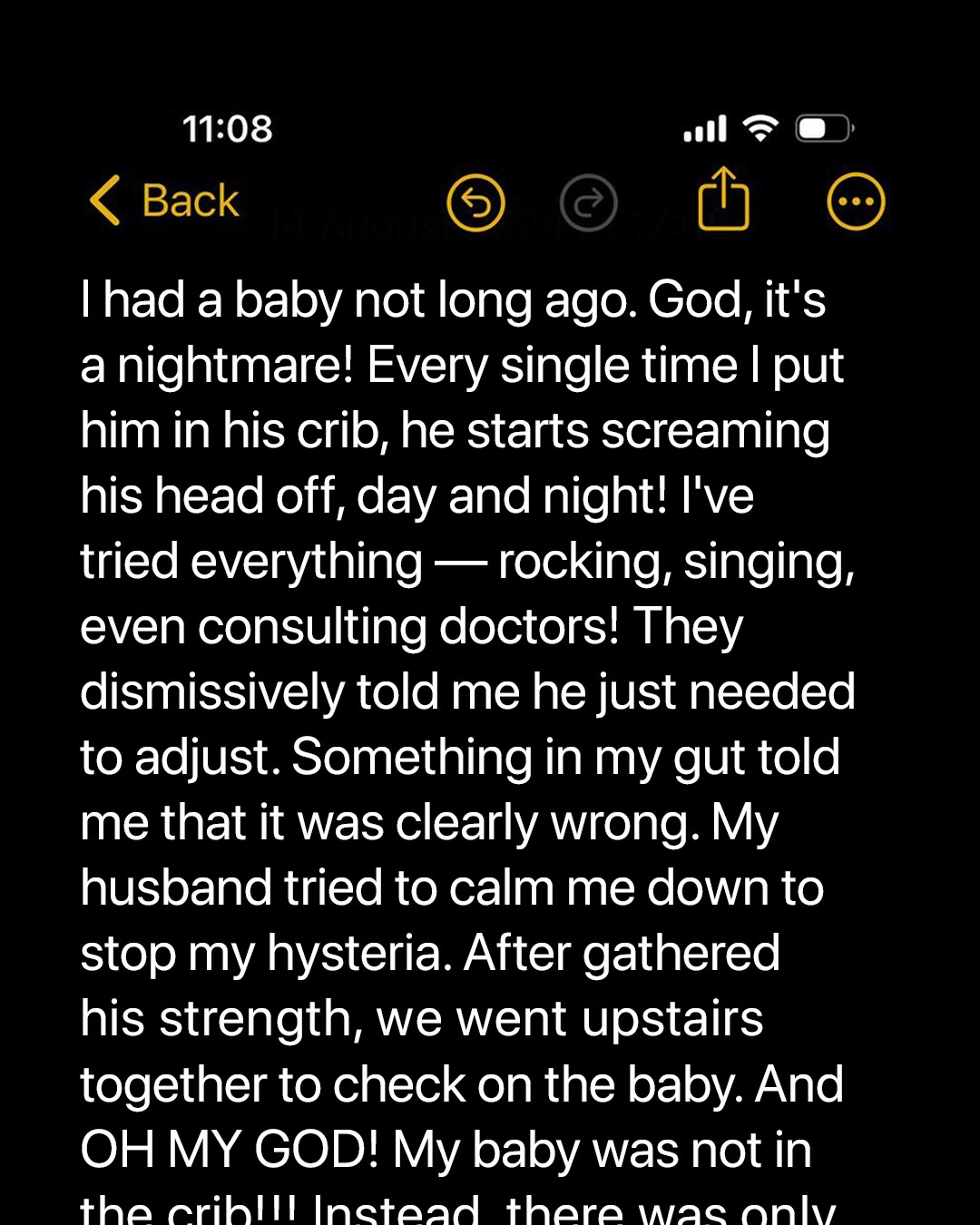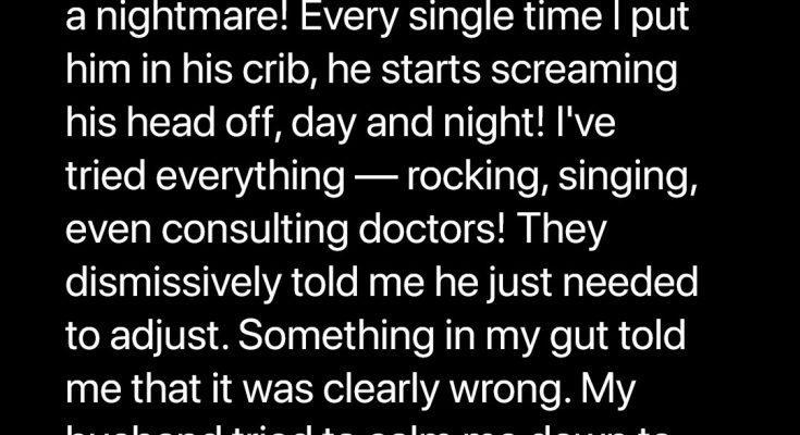 Walter returns home from work to find his baby son crying. His wife has tried everything to quiet their son, but nothing works. Walter decides to check the crib and is shocked by what he finds there.An ear-splitting wail echoed through the house as Walter entered from the garage. His wife, Abby, sat in the kitchen, and by the distressed look on her face, he knew Logan’s cries were bothering her again.“Oh, honey,” he says and hugs her from behind. “How long has he been crying like that?”