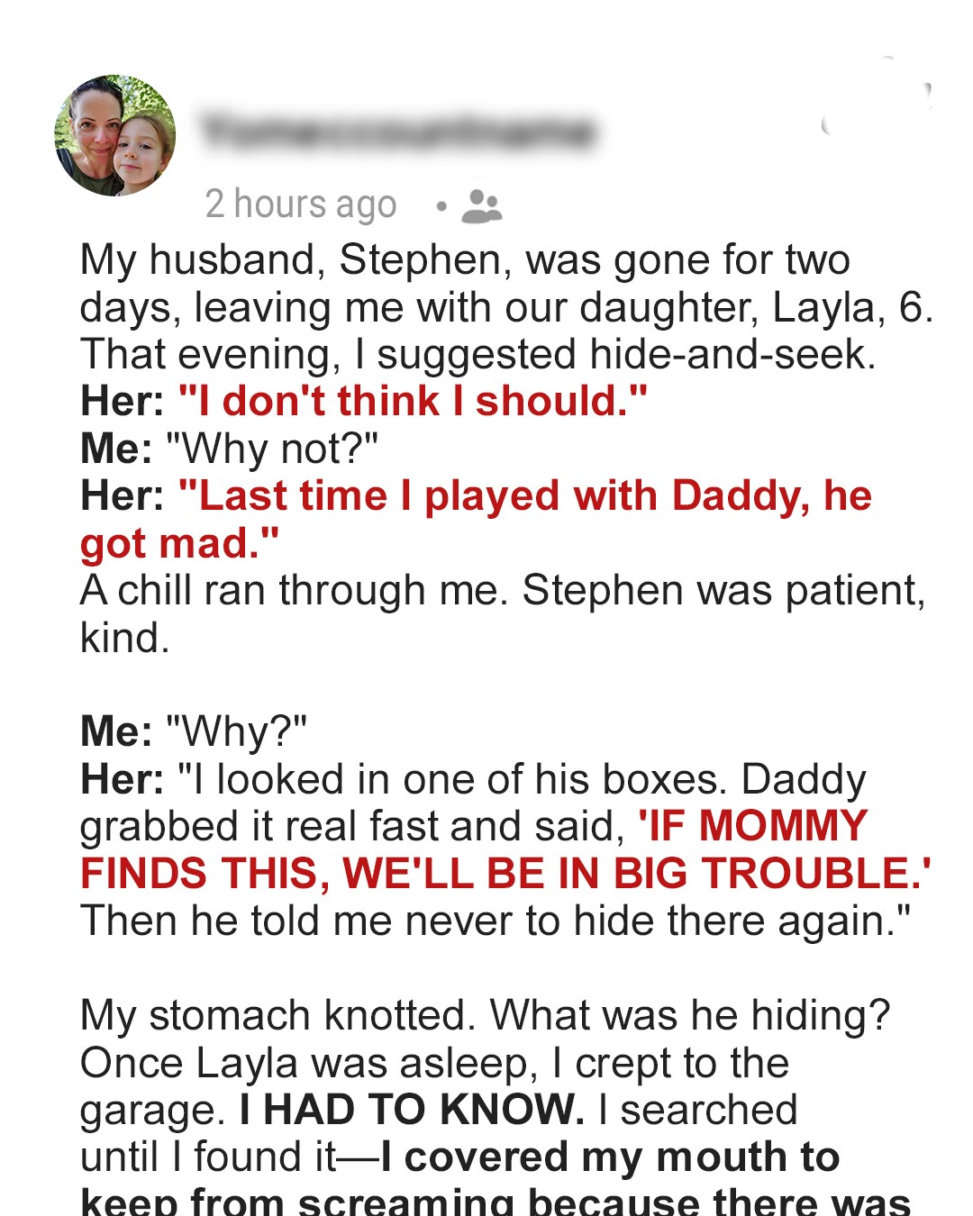 Piper’s world shatters when her six-year-old daughter innocently reveals a secret, one her husband, Stephen, has been hiding for years. A single mistake, a buried truth, and a love too profound to break. Now, Piper must decide: should she confess and risk everything or stay silent and protect the life they’ve built?Stephen had been gone for exactly seven hours when Layla told me about the box.It was a rare two-day trip to visit his mother in another state, leaving me and our six-year-old daughter to ourselves. We’d had an easy, slow evening with mac and cheese for dinner, cartoons playing in the background, and Layla’s little legs curled up beside me on the couch.