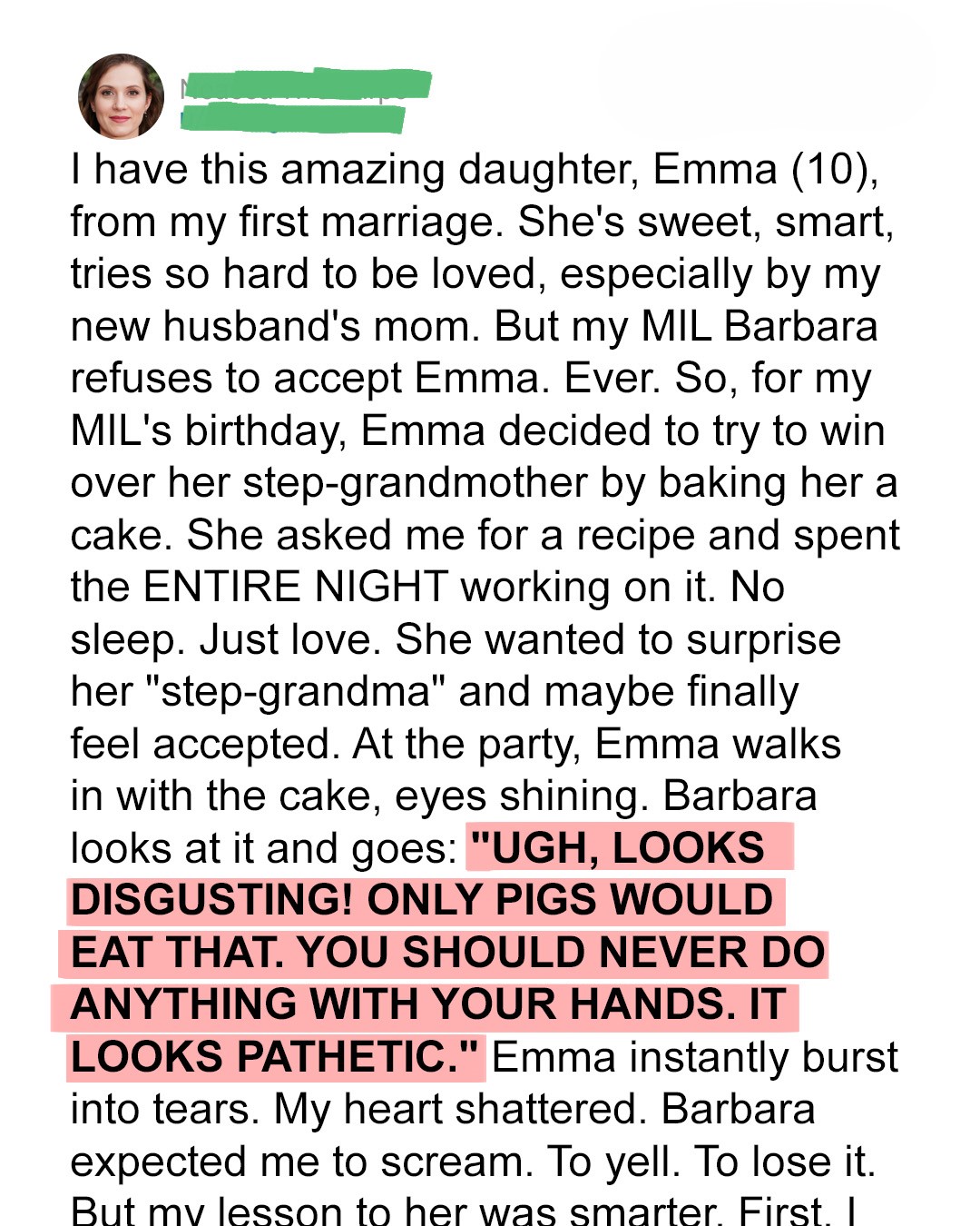 Barbara shot me a look of pure venom, but I just smiled back sweetly. She knew she had been outplayed, and there was nothing she could do about it. Emma beamed as we all enjoyed her delicious cake together. This time, it was a celebration full of love and acceptance, exactly what Emma deserved.