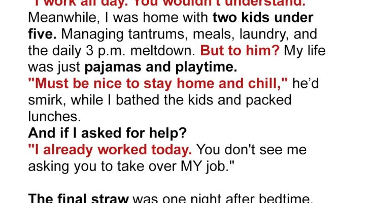 They say revenge is best served cold, but mine came with a side of baby spit-up and toddler tantrums. When my husband claimed I “do nothing all day,” I decided to give him the relaxing day at home he thought I enjoyed. I disappeared for 12 hours, and what happened next was something he wasn’t expecting.At 5:30 a.m., most people are asleep. But for me, it’s when my day begins.It’s not by choice. It’s because Lily, my eight-month-old human alarm clock, has decided that’s when the world should wake up.