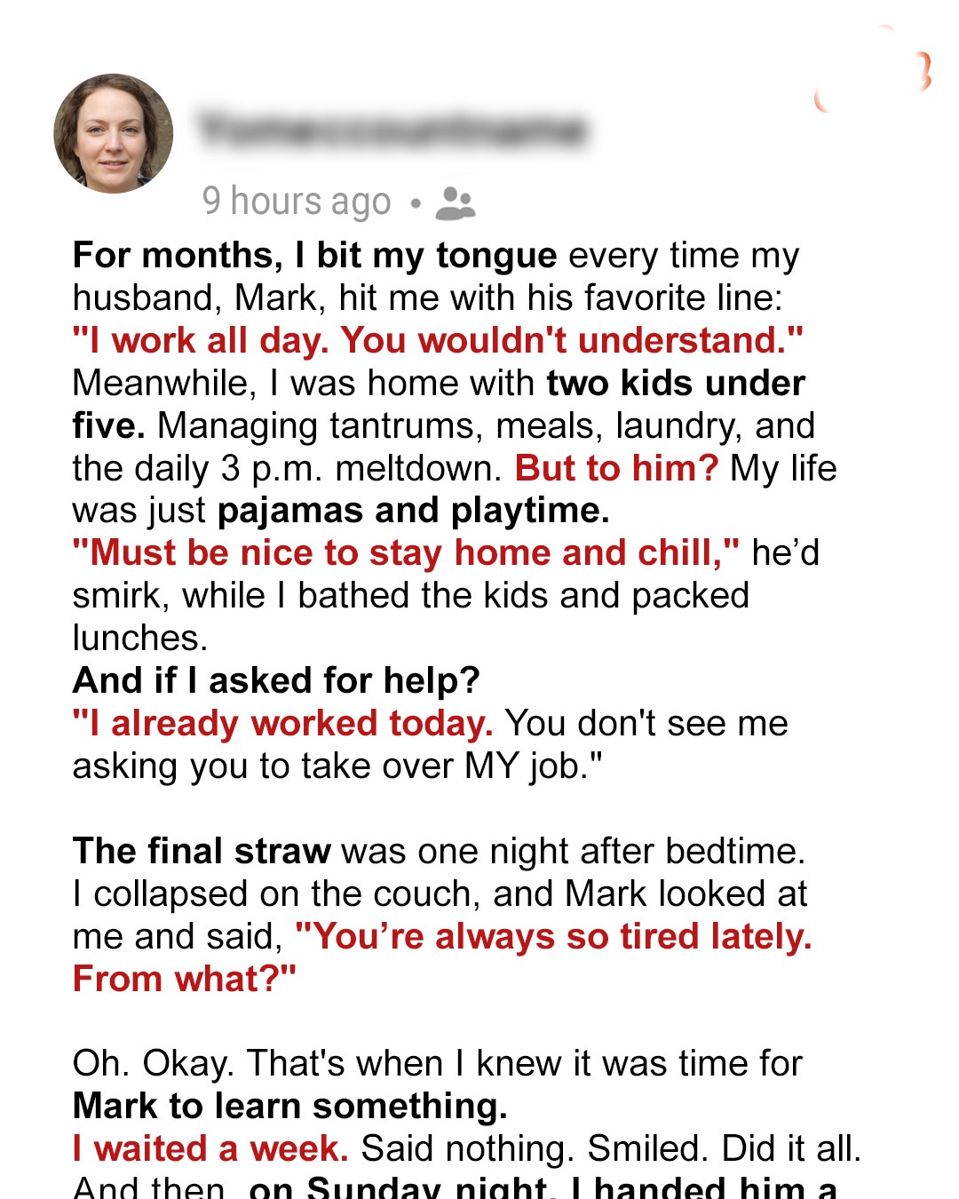 “Your day off,” I said sweetly, folding laundry beside him on the couch. “You keep telling me how easy I have it. So, next Saturday, it’s all yours. I’m giving you exactly what you deserve.”