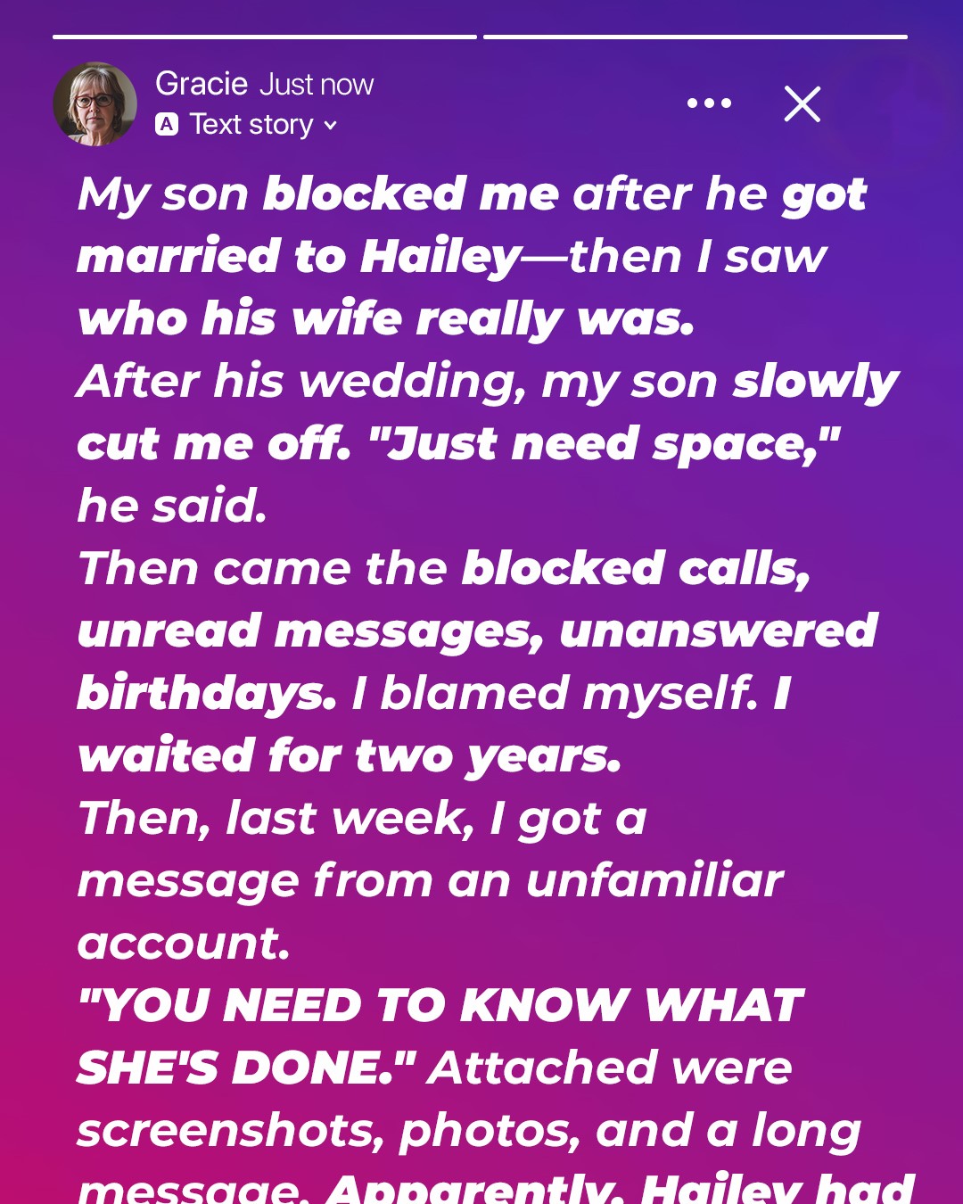 “Hi. It’s Mom. I’d really like to see you. Just dinner. No pressure. Please don’t tell Hailey. Just you and me, okay?”