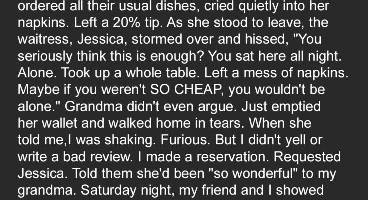 “Hi,” I said, sweet as syrup. “I’d like to make a reservation for two. Saturday night. And actually, could we request Jessica as our server? My grandmother was in the other night, and Jessica was just so wonderful to her!”