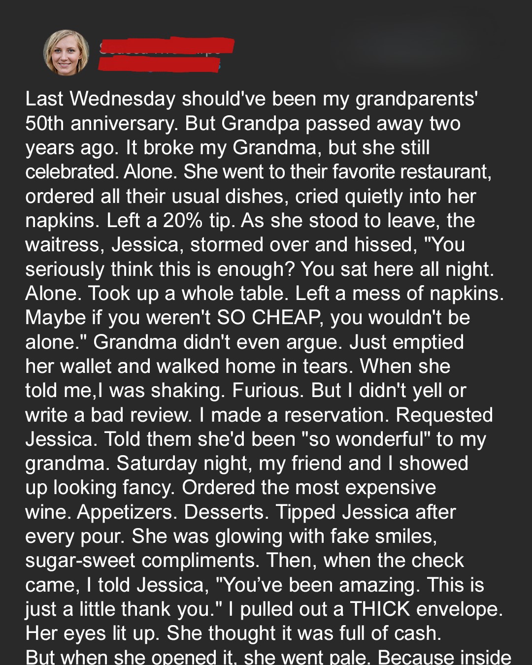 “To our lovely waitress, Jessica. Thank you, not just for the service tonight, but for the way you treated my grandmother a few nights ago… when she came in alone, mourning her husband of 50 years.”