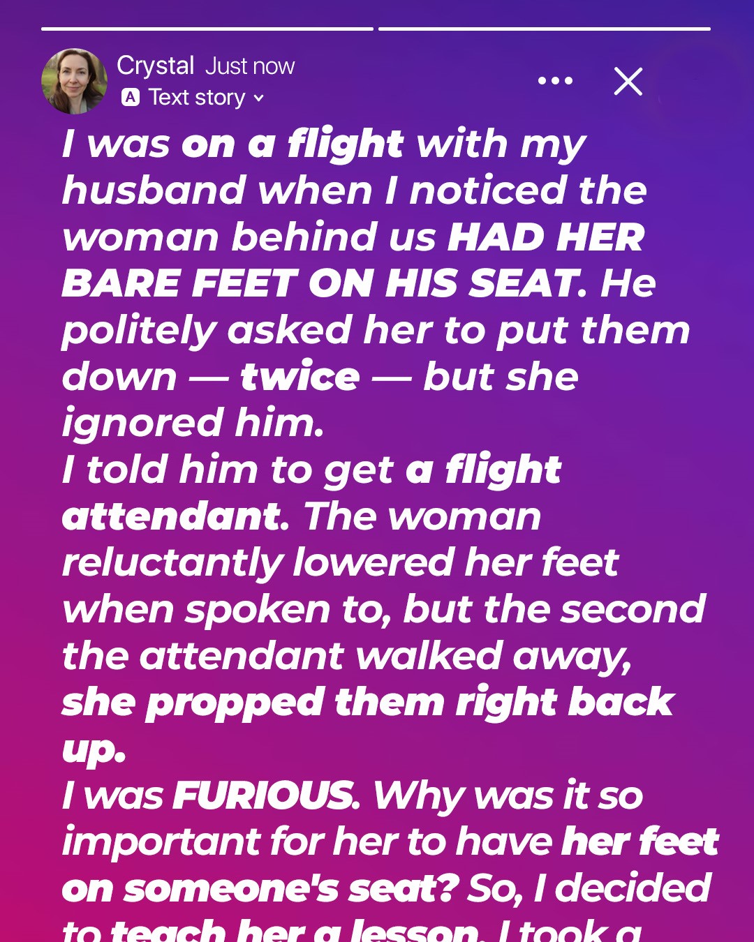 While Crystal and her husband, Alton, are on a flight home, they encounter an annoying passenger who continuously kicks against Alton’s seat. After asking her to stop numerous times, Crystal decides to take matters into her own hands.I was on a flight with my husband last night. We were finally on our way back home after spending a week with his parents. I couldn’t wait to be back in my own bed.“I’ve missed our shower the most,” Alton said. “Mom and dad’s place is okay, but our water pressure is unbeatable.”